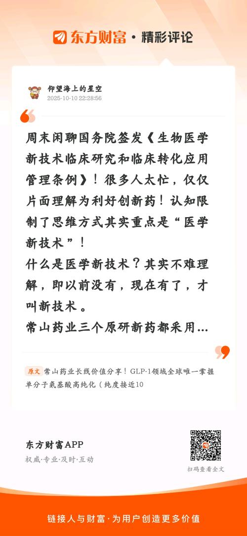 //@仰望海上的星空 :周末闲聊国务院签发《生物医学新技术临床研究和临床转化应用管理条例》!很多人太忙,仅仅片面理解为利好创新药!认知限制了思维方式其实重点是“医学新技术”!什么是医学新技术?其实不难理解,即以前没有,现在有了,才叫新技术。常山药业三个原研新药都采用了“医学新技术”。代谢综合征原研新药阿贝那肽采用了整个流程的新技术。(一))单体氨基酸高纯化植物源提取,纯度接近100%。(二)40个单体氨基酸脱水缩合得到高纯化多肽化合物,纯度接近100%。(三)全球首个GLP-1RA偶合产品。(四)全球首个可停药长时间不反弹的GLP-1RA周剂。(五)全球首个将免疫原性成分在生产过程中分离的GLP-1RA周剂。抗晚期恶性肿瘤药(晚癌)3456片和4523片同样采用了“医学新技术”,是全球首个非嘧啶小分子抑制剂进入临床(备注一下,目前已上市的最新抗癌药是嘧啶类大分子化合物,比如默沙东的K药),新的分子式化合物,新的作用机制(断根直接衰亡肿瘤,团灭癌细胞)。一天到晚分析K线价格走势没用,常山药业已极度控盘,上下均不会过度放量,因为绝大多数人押注长线投资,不想投机!