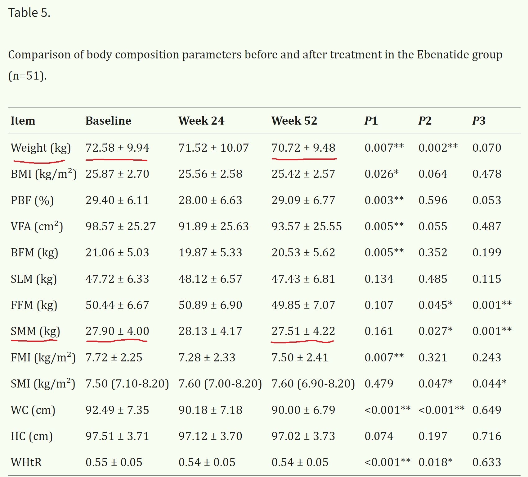 $常山药业(SZ300255)$ 南京市第一医院内分泌科2023年做过一次每周注射2mg艾本那肽,52周后身体成分变化试验,结果显示52周减重1.8公斤,其中包括减少了0.4公斤肌肉,减肌比22%,各位常山艾本那肽粉丝怎么看?