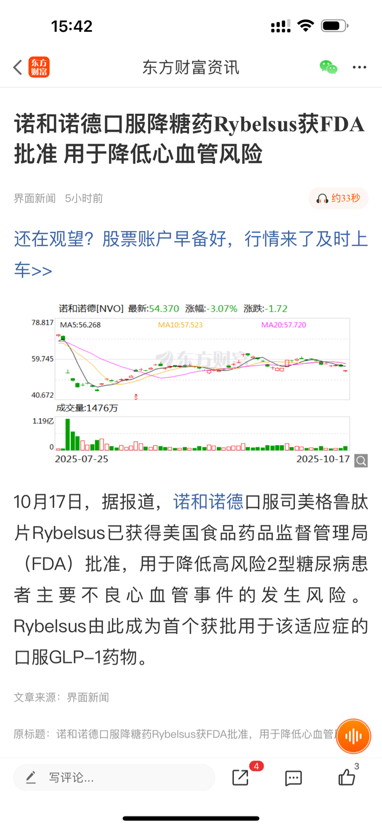 Rybelsus由此成为首个获批用于该适应症的口服GLP-1药物。诺和诺德口服司