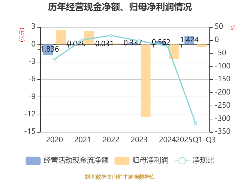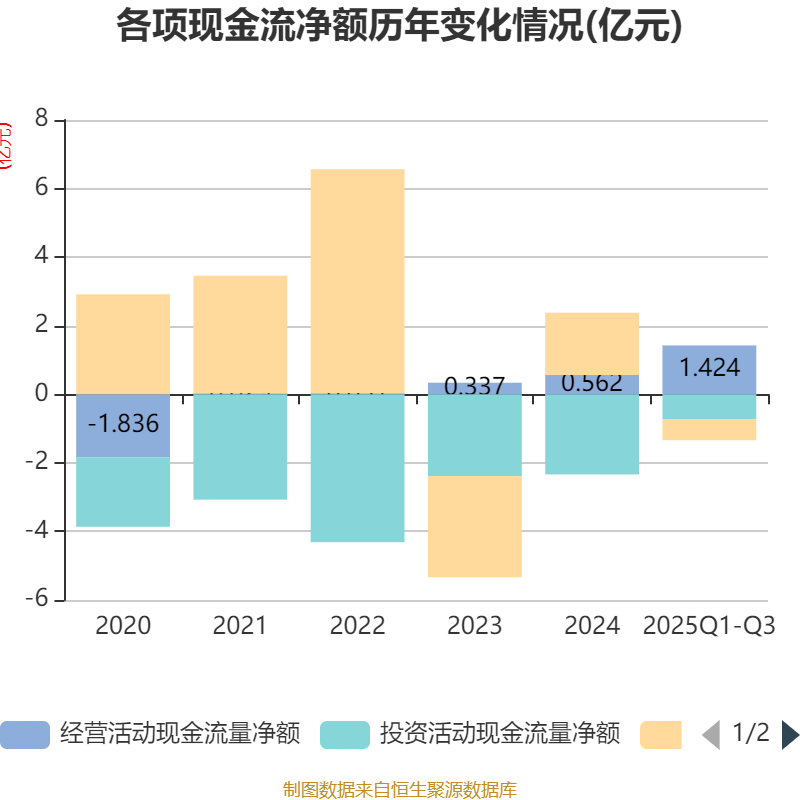 2025年前三季度,公司经营活动现金流净额为1.42亿元,同比下降5.32%;筹资活动现金流净额-6185.88万元,同比减少1.13亿元;投资活动现金流净额-7210.12万元,上年同期为-1.18亿元。