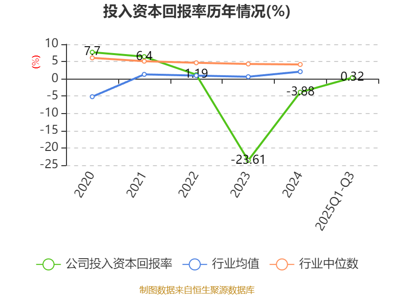 盈利能力方面, 2025年前三季度公司加权平均净资产收益率为-2.91%,同比下降3.31个百分点。公司2025年前三季度投入资本回报率为0.32%,较上年同期下降0.67个百分点。