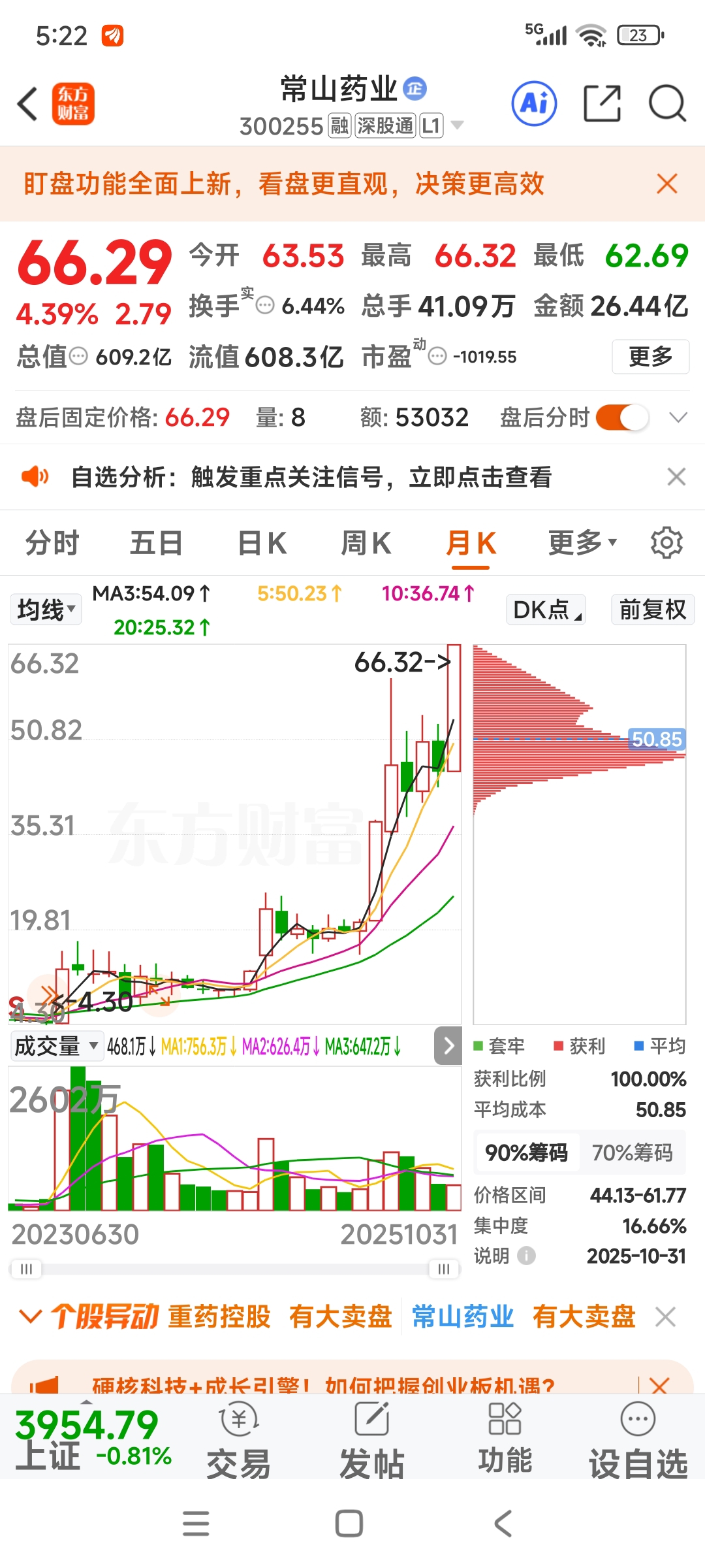 $常山药业(SZ300255)$ 月线看,本轮更为强势,光头大阳月线,差3分最高点收盘,下月可期!