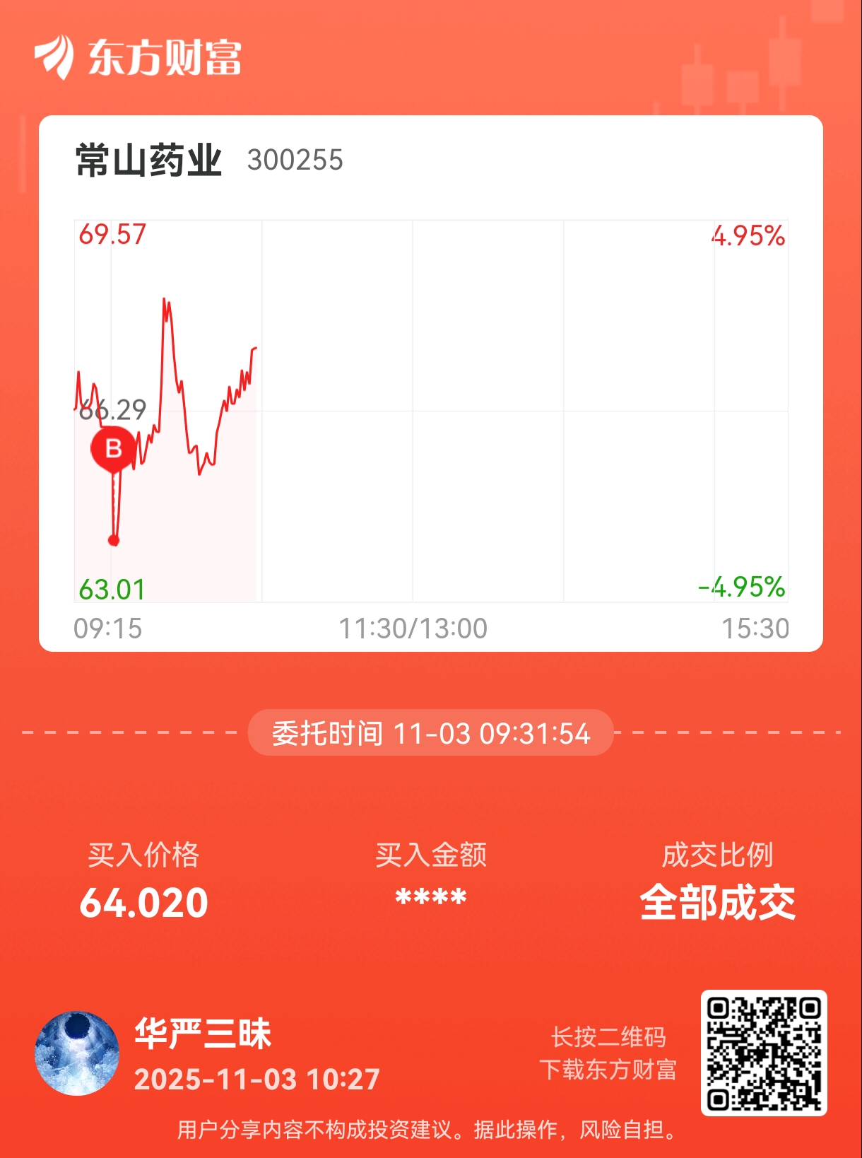 $常山药业(SZ300255)$ $平潭发展(SZ000592)$ $通化金马(SZ000766)$ 平潭发展高开涨停,意料之中,继续等板,逐步减仓。常山药业开盘直线砸直线拉,但是没量,暴力洗盘杀韭菜,所以底部果断加仓,我的主账号已经满仓,所以拿这里的小仓位加,顺便打脸一些发了帖子看常山反弹后又删了贴的空够,加了的仓位水线卖了,做t不求完美,只是加强持股信心,这点当时我在翰宇就一直告诉你们。对比翰宇的洗盘,两边操盘手天差地别,翰宇通杀,只想吃独食,结果散户越洗越多,常山洗的是韭菜,对高手大户以及死拿的毫无影响,所以才能节节高升。