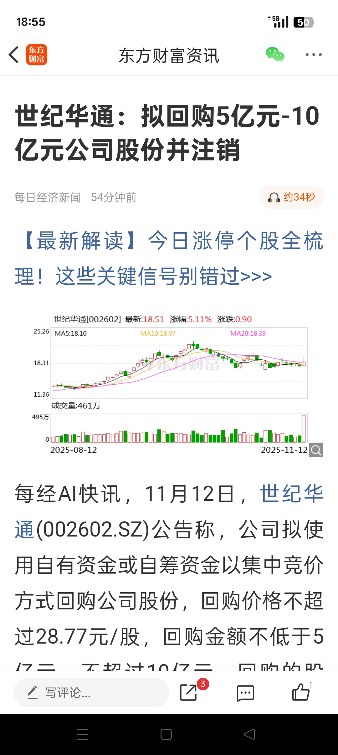 第一天买盘后出利好,世纪华通回购5亿到10亿后注销。