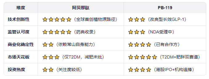 阿贝那肽胜在“原创性+安全性”,PB-119赢在“商业化速度+适应症广度”。