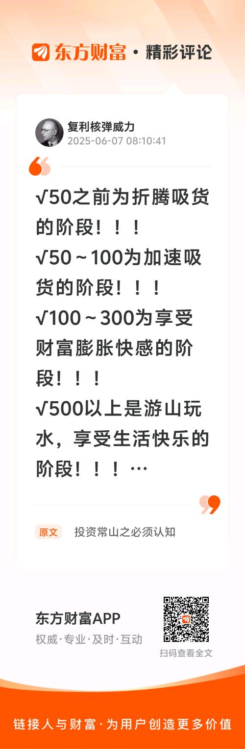 //@复利核弹威力 :√50之前为折腾吸货的阶段!!!√50~100为加速吸货的阶段!!!√100~300为享受财富膨胀快感的阶段!!!√500以上是游山玩水,享受生活快乐的阶段!!!√1000以上是人生成功傲慢的阶段!!!现在深股通扫货,将来全球通扫荡。。。正在进行中