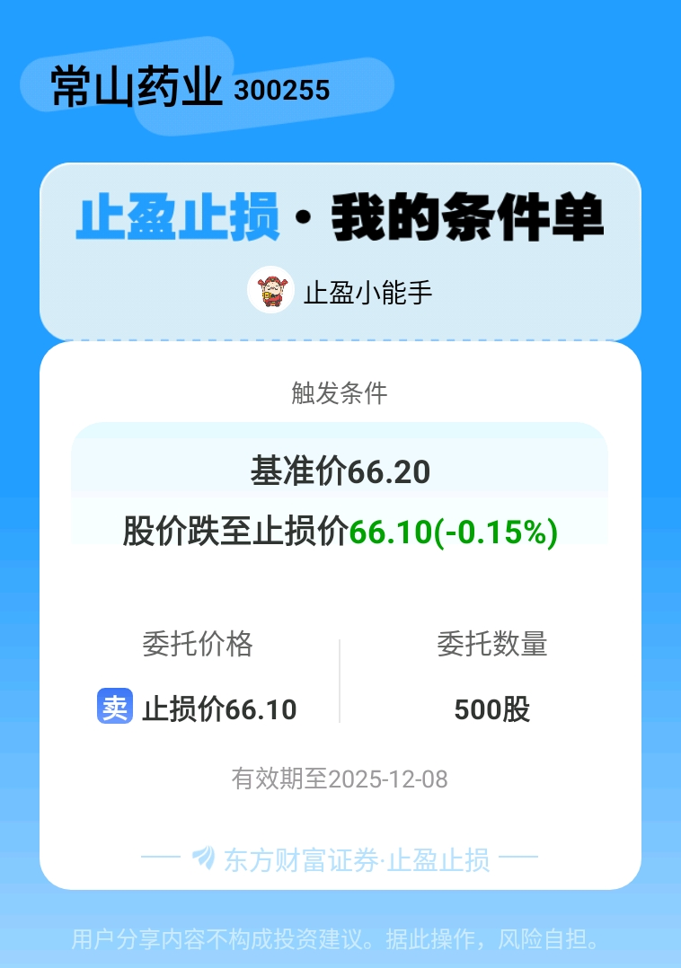 #条件单交流# #止盈止损晒单# 一位股神设置了一个止盈止损条件单,接下来就是见证奇迹的时刻~$常山药业(SZ300255)$