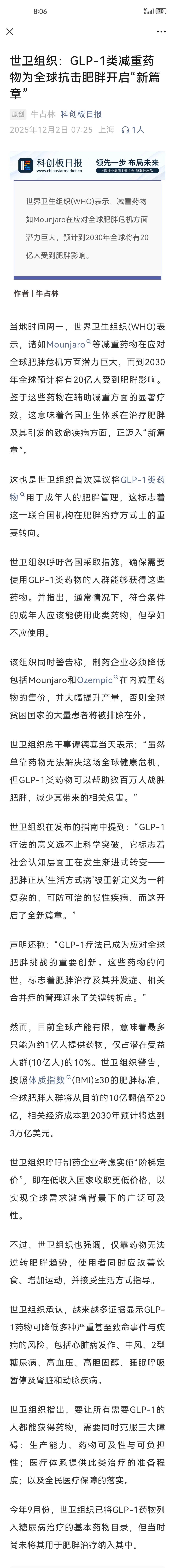世卫组织:GLP-1类减重药物为全球抗击肥胖开启“新篇章”@七十二万股先生@纯净