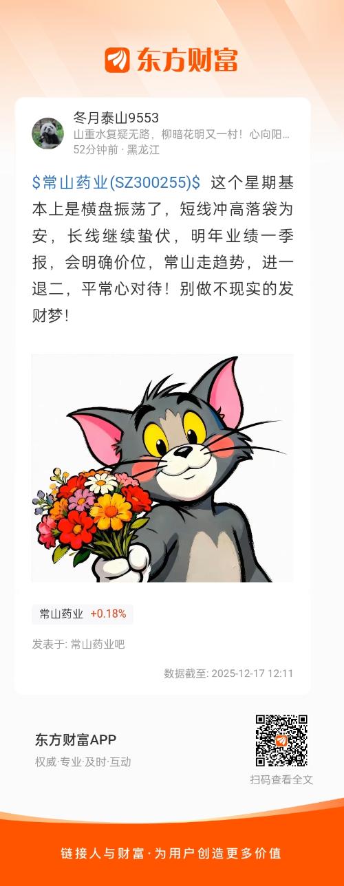 $常山药业(SZ300255)$ 这个星期基本上是横盘振荡了,短线冲高落袋为安,长线继续蛰伏,明年业绩一季报,会明确价位,常山走趋势,进一退二,平常心对待!别做不现实的发财梦!