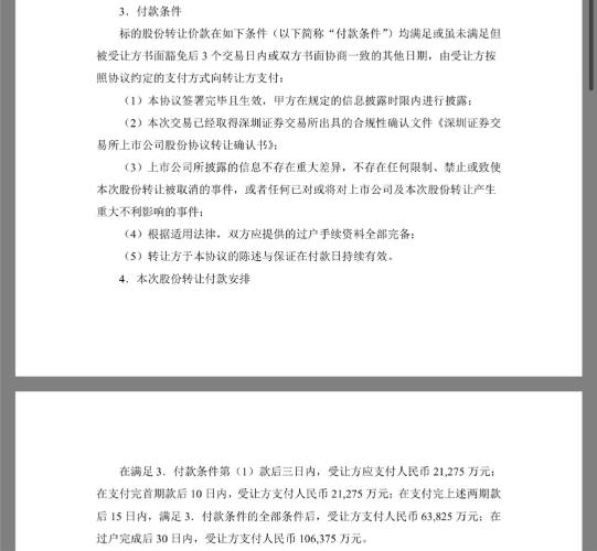 《在满足 3.付款条件第(1)款后三日内,受让方应支付人民币21,275 万元;在支付完首期款后 10 日内,受让方支付人民币 21,275 万元;在支付完上述两期款后 15 日内,满足 3.付款条件的全部条件后,受让方支付人民币63,825 万元;在过户完成后 30 日内,受让方支付人民币 106,375 万元。5.标的股份的过户受让方在根据本协议相关条款支付股权转让价款的50%,即人民币106,375万元后,双方应在三个工作日内共同到深圳证券交易所、中国证券登记结算公司深圳分公司办理将标的股份过户至受让方名下的手续。》