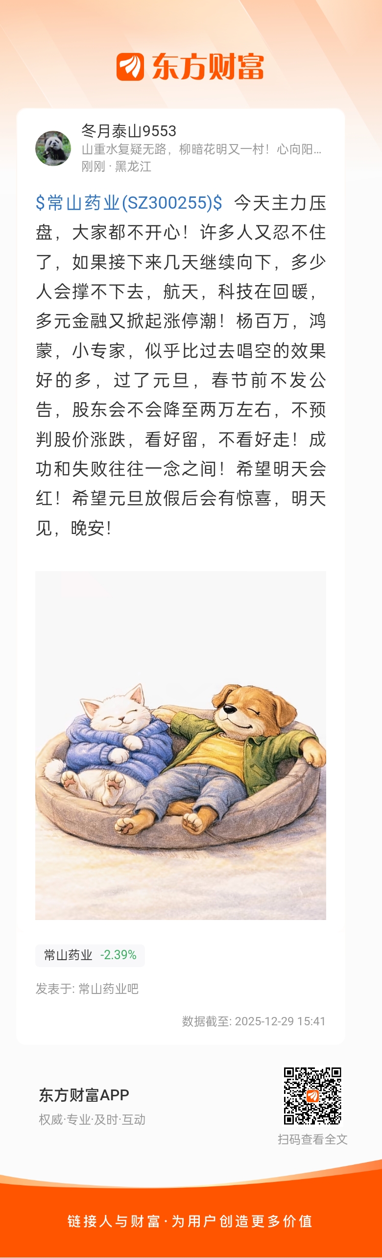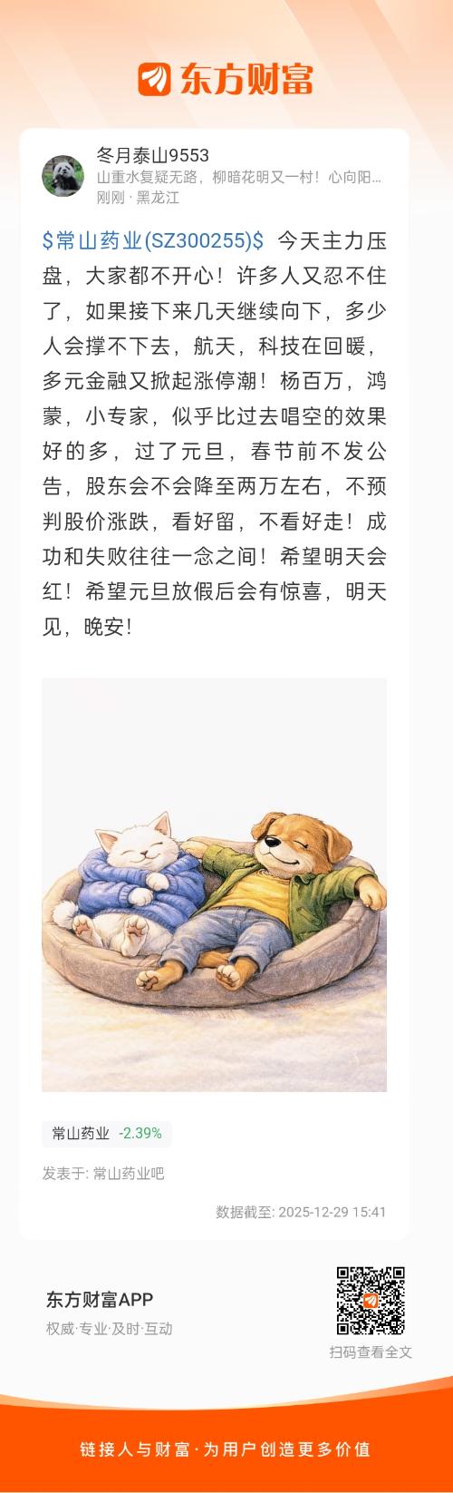 $常山药业(SZ300255)$ 今天主力压盘,大家都不开心!许多人又忍不住了,如果接下来几天继续向下,多少人会撑不下去,航天,科技在回暖,多元金融又掀起涨停潮!杨百万,鸿蒙,小专家,似乎比过去唱空的效果好的多,过了元旦,春节前不发公告,股东会不会降至两万左右,不预判股价涨跌,看好留,不看好走!成功和失败往往一念之间!希望明天会红!希望元旦放假后会有惊喜,明天见,晚安!