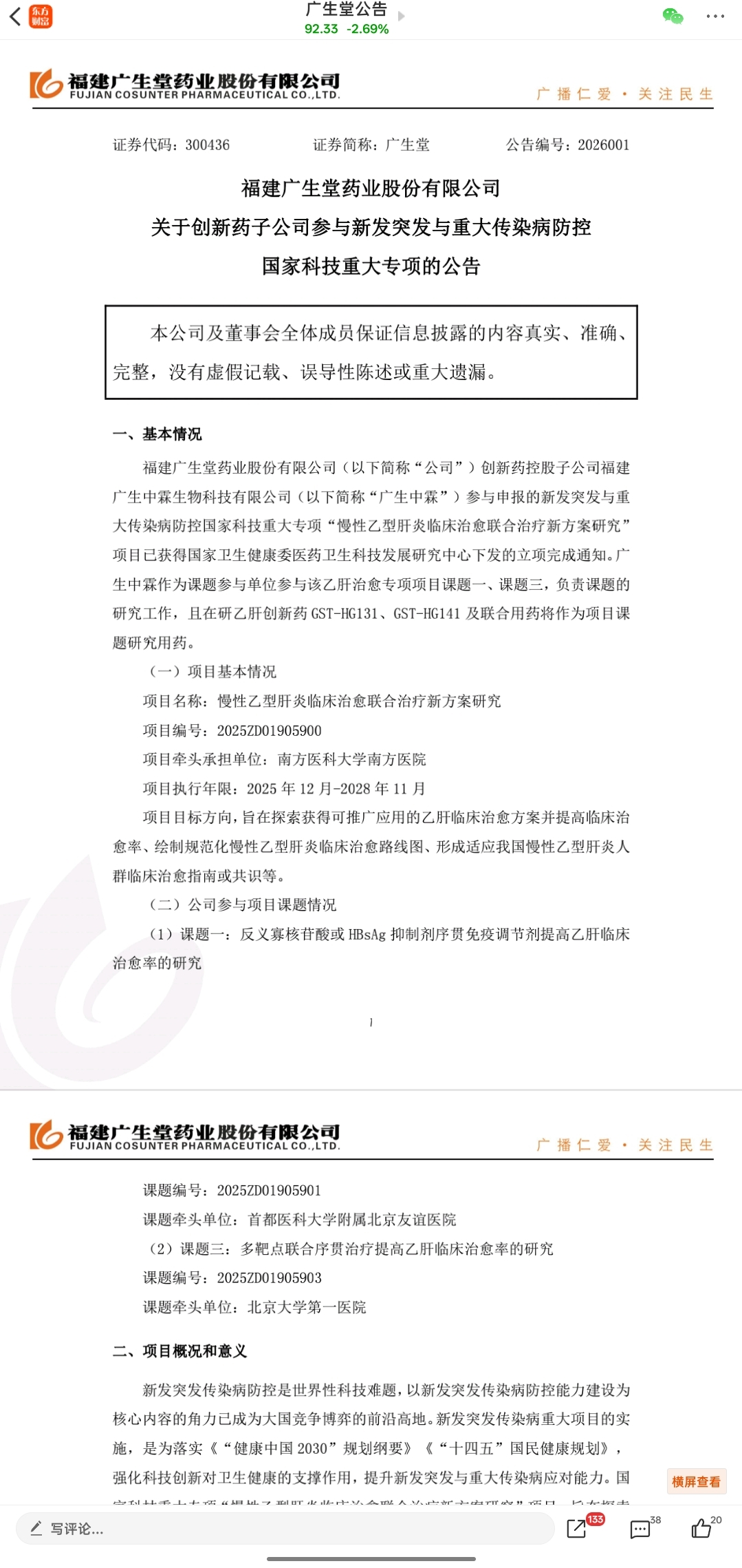 (突发广生堂携两款乙肝创新药参与国家级专项,探索“中国治愈方案”参与的“新发突发与重大传染病防控”国家重大专项十五五规划估值千亿