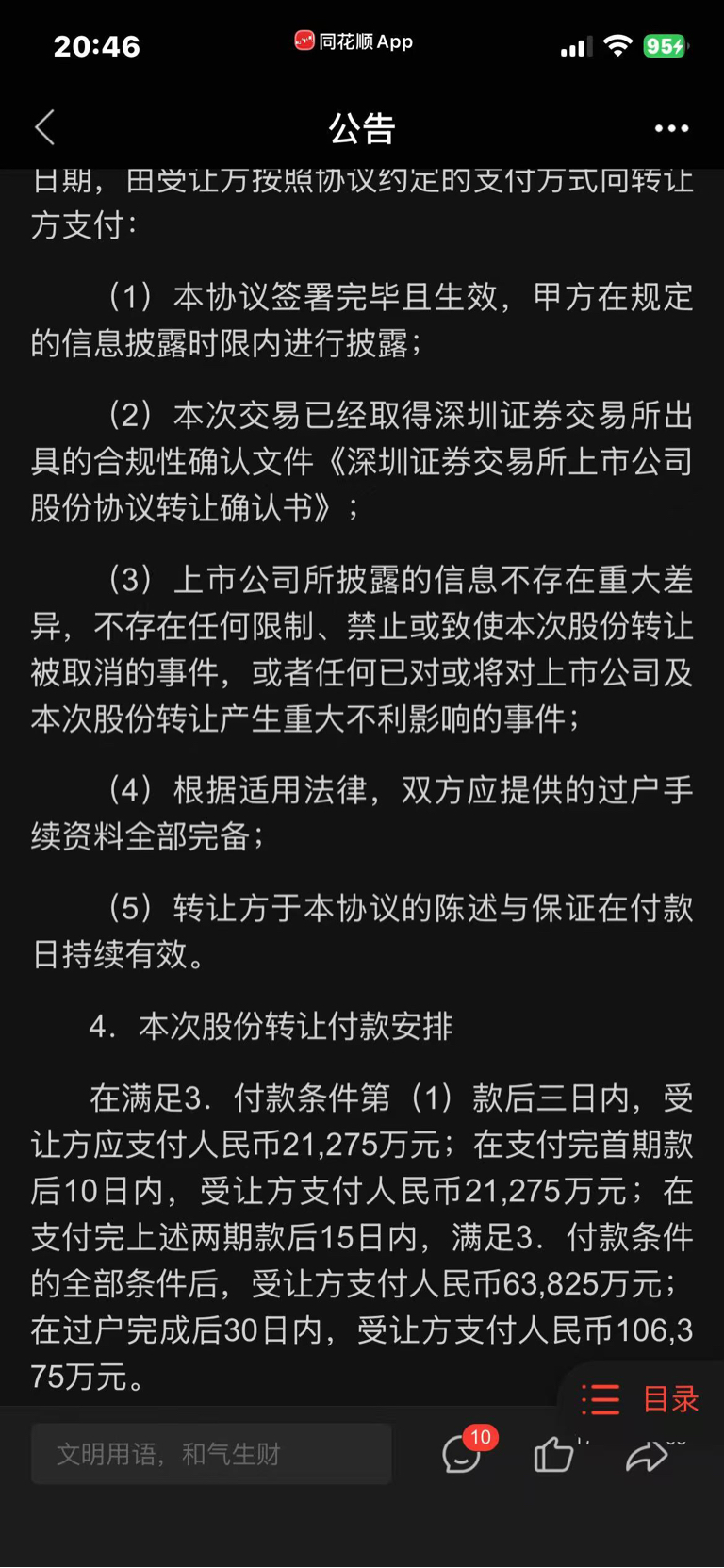 $常山药业(SZ300255)$ 付款条件3且满足第一条支付2.1亿,付完10日内在付2.1亿,在满足付款条件的全部条件支付6.3.亿,现在没有满足第二条,合规性确认文件,也就是元素到现在付了4.2亿,现在就是等深圳证券交易所上市公司股份协议转让确认书