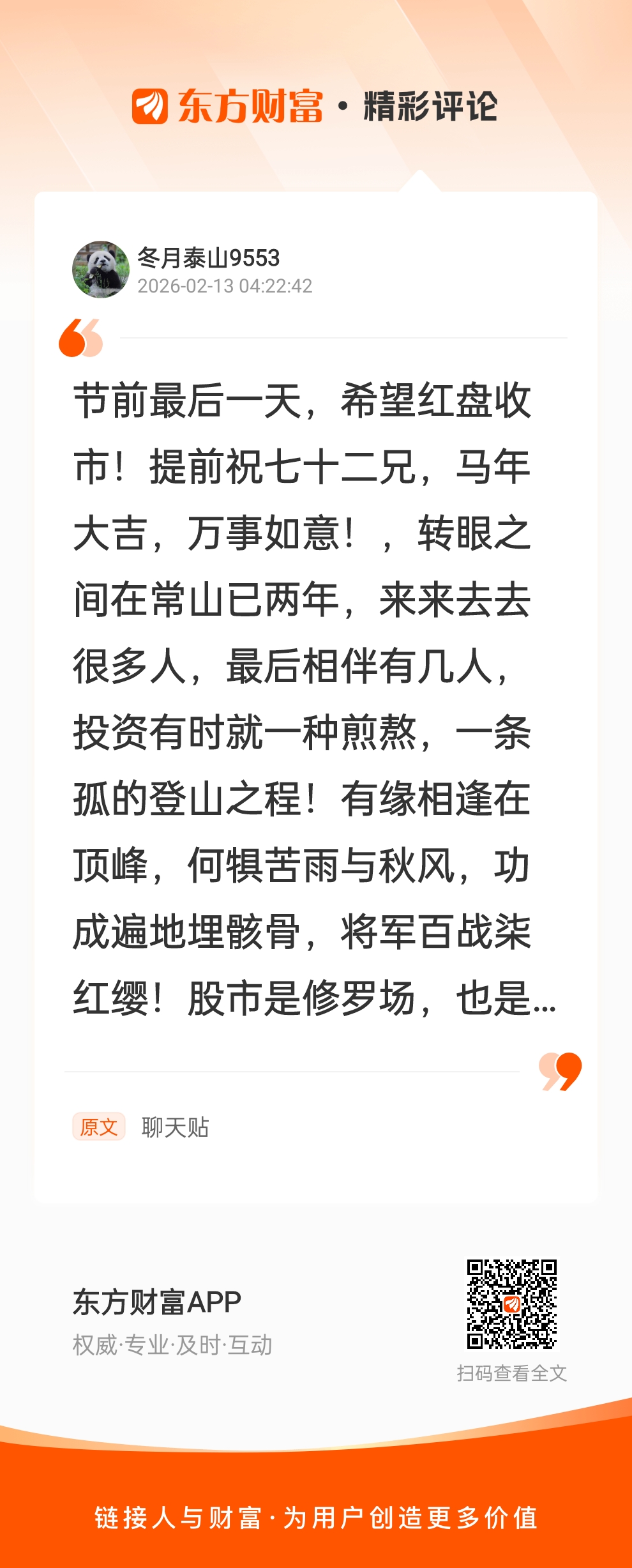 节前最后一天,希望红盘收市!提前祝七十二兄,马年大吉,万事如意!,转眼之间在常山已两年,来来去去很多人,最后相伴有几人,投资有时就一种煎熬,一条孤的登山之程!有缘相逢在顶峰,何犋苦雨与秋风,功成遍地埋骸骨,将军百战柒红缨!股市是修罗场,也是黑暗森林,能活着走出去有几人 我在《聊天贴》的评论获得了大家的关注。