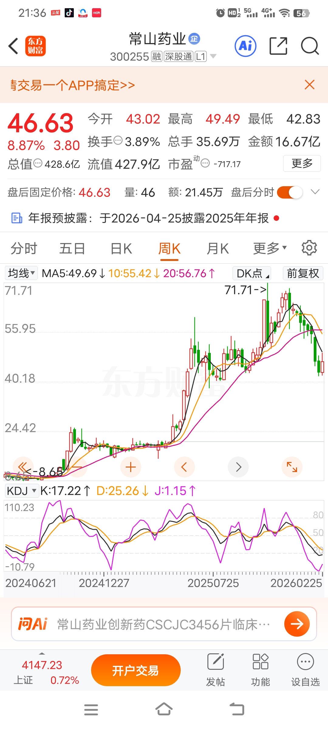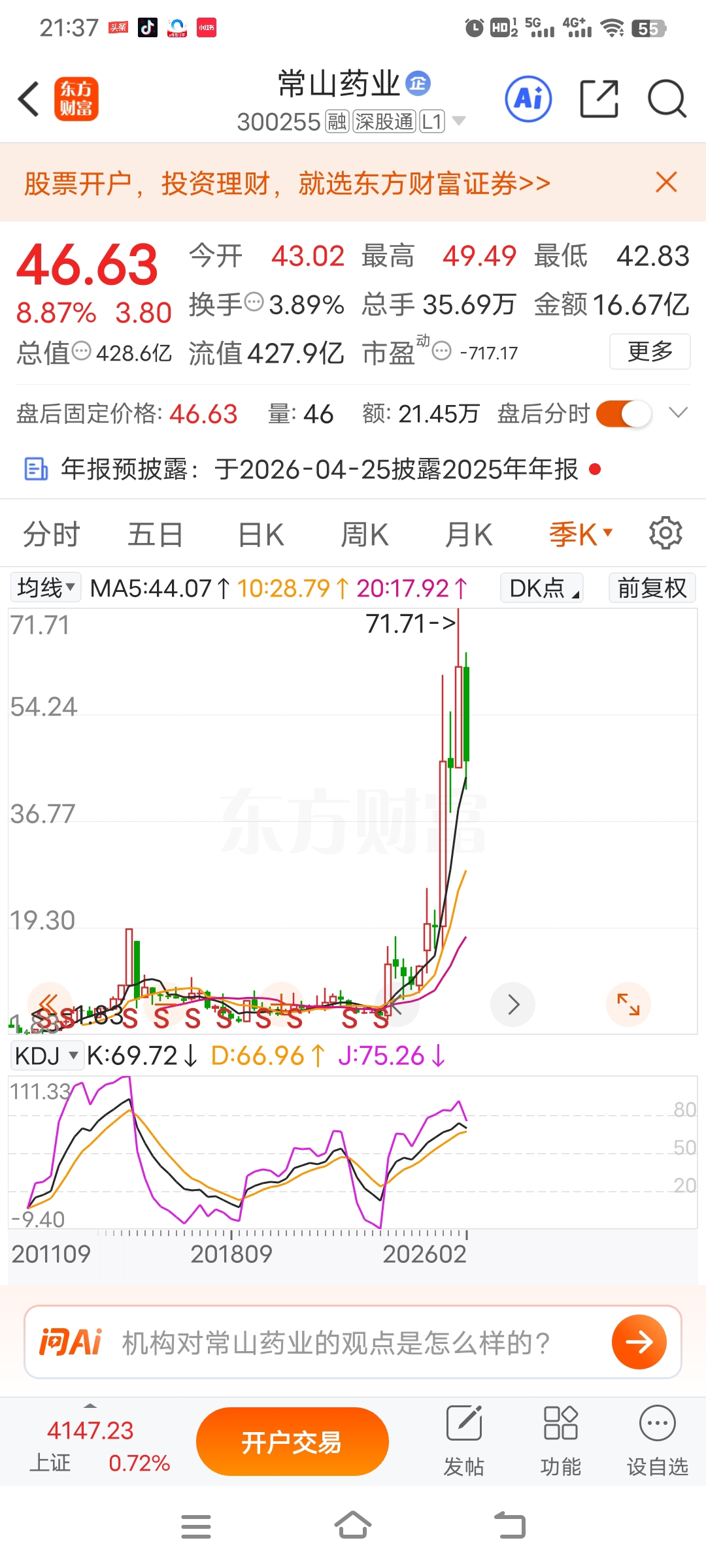 常山获批到拿证最快都可能是六月份了。心急没有用。技术指标上大家看一下月线指标在超卖区,向下发散。周线更不用说,必须再调整一下才能走好。就是明天公告说上市获批到制证完成最快都是4月末了。所以急没有用。这个月月线是阴线,下个月仍然是向下调整。今天的话留着验证。
