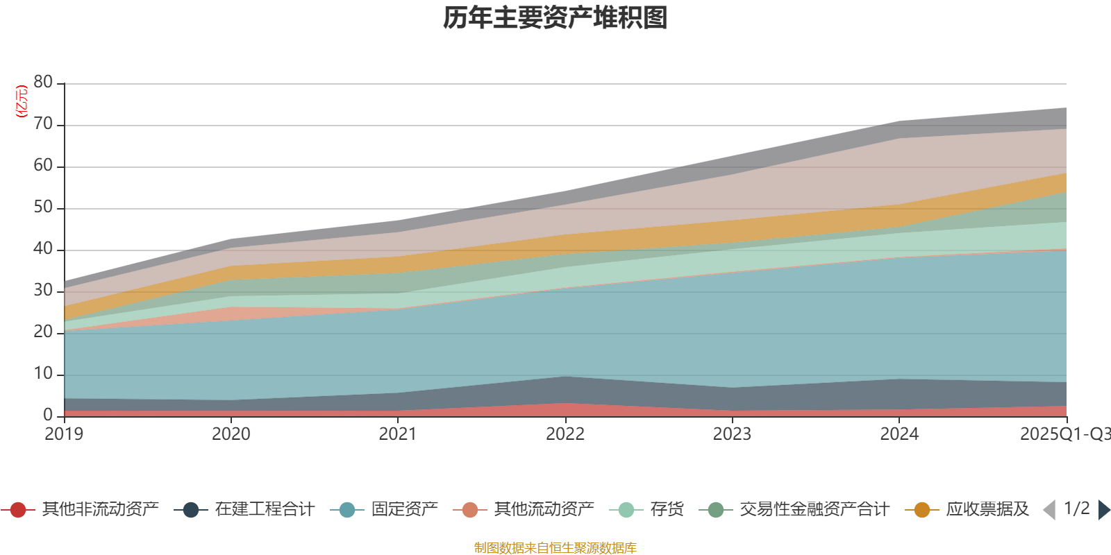 资产重大变化方面,截至2025年三季度末,公司货币资金较上年末减少33.09%,占公司总资产比重下降8.02个百分点;交易性金融资产合计较上年末增加375.19%,占公司总资产比重上升7.6个百分点;在建工程合计较上年末减少21.91%,占公司总资产比重下降2.62个百分点;固定资产较上年末增加8.64%,占公司总资产比重上升1.61个百分点。