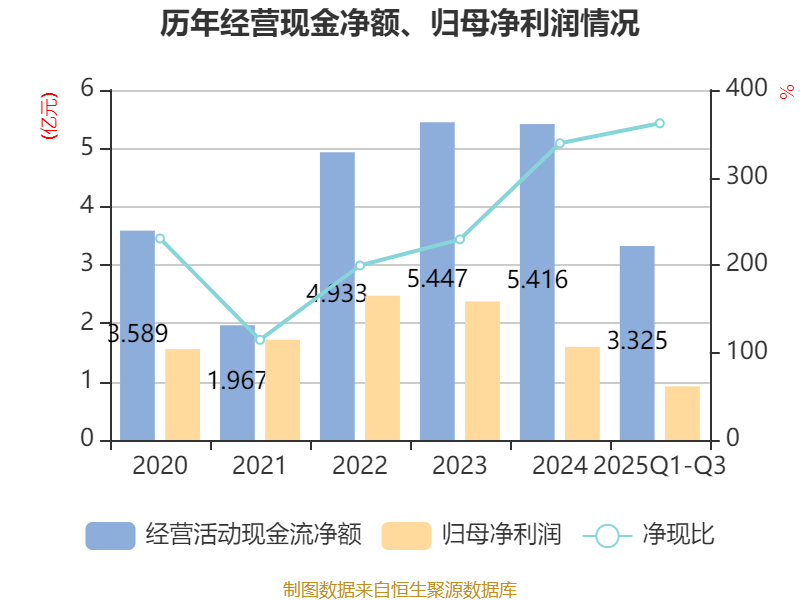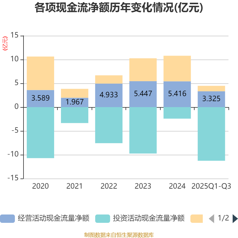 2025年前三季度,公司经营活动现金流净额为3.33亿元,同比下降6.08%;筹资活动现金流净额1.15亿元,同比减少2.67亿元;投资活动现金流净额-11.27亿元,上年同期为-5.74亿元。