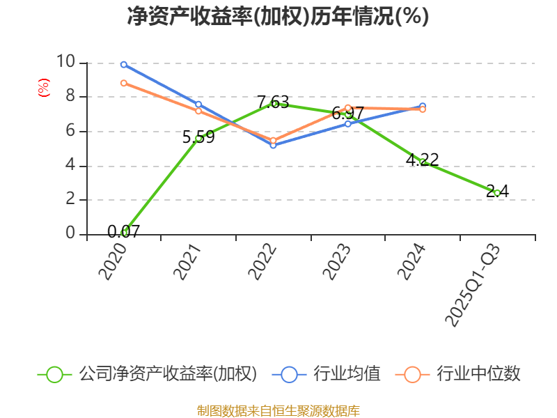 盈利能力方面, 2025年前三季度公司加权平均净资产收益率为2.4%,同比下降0.67个百分点。公司2025年前三季度投入资本回报率为1.77%,较上年同期下降0.84个百分点。