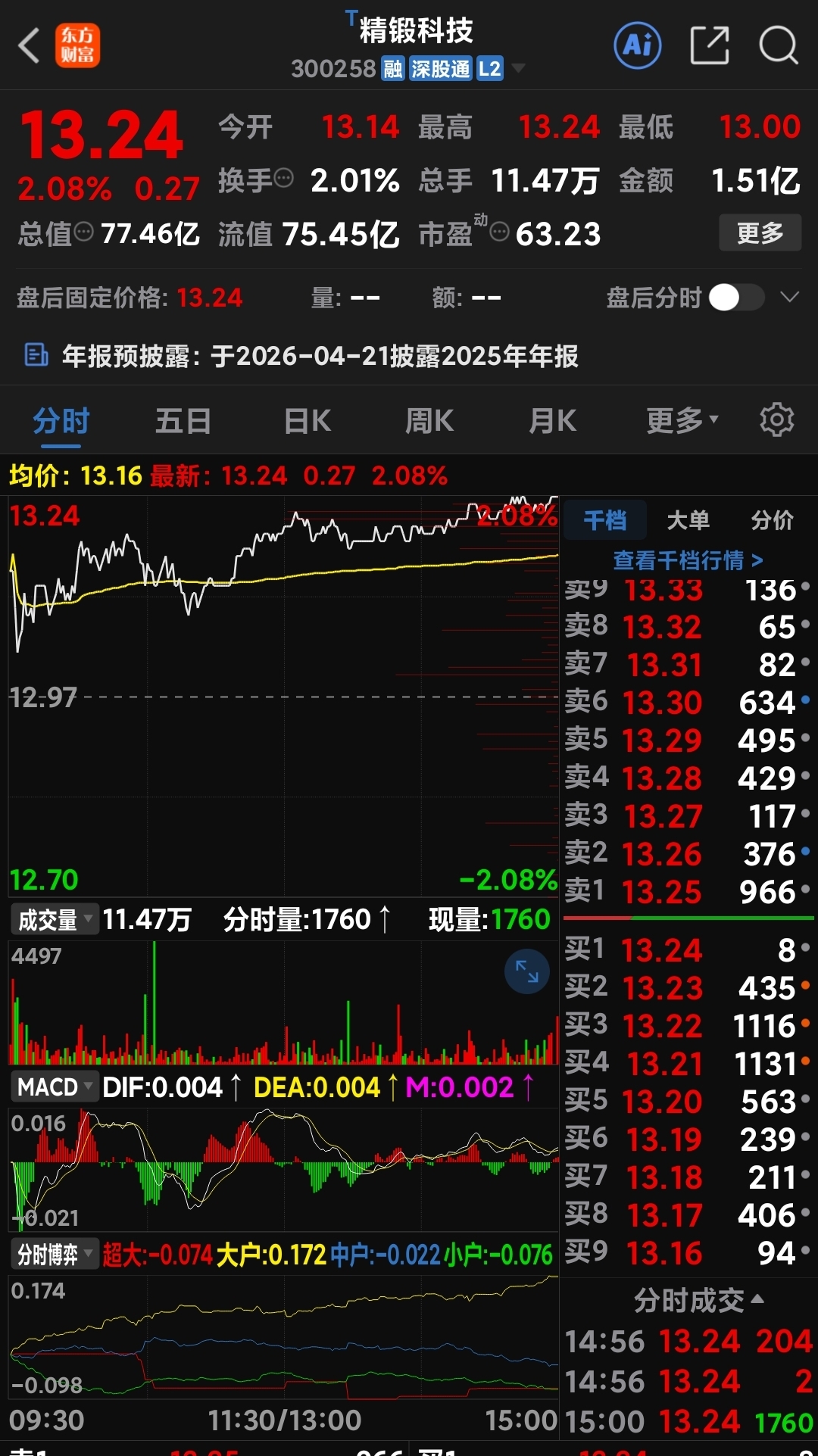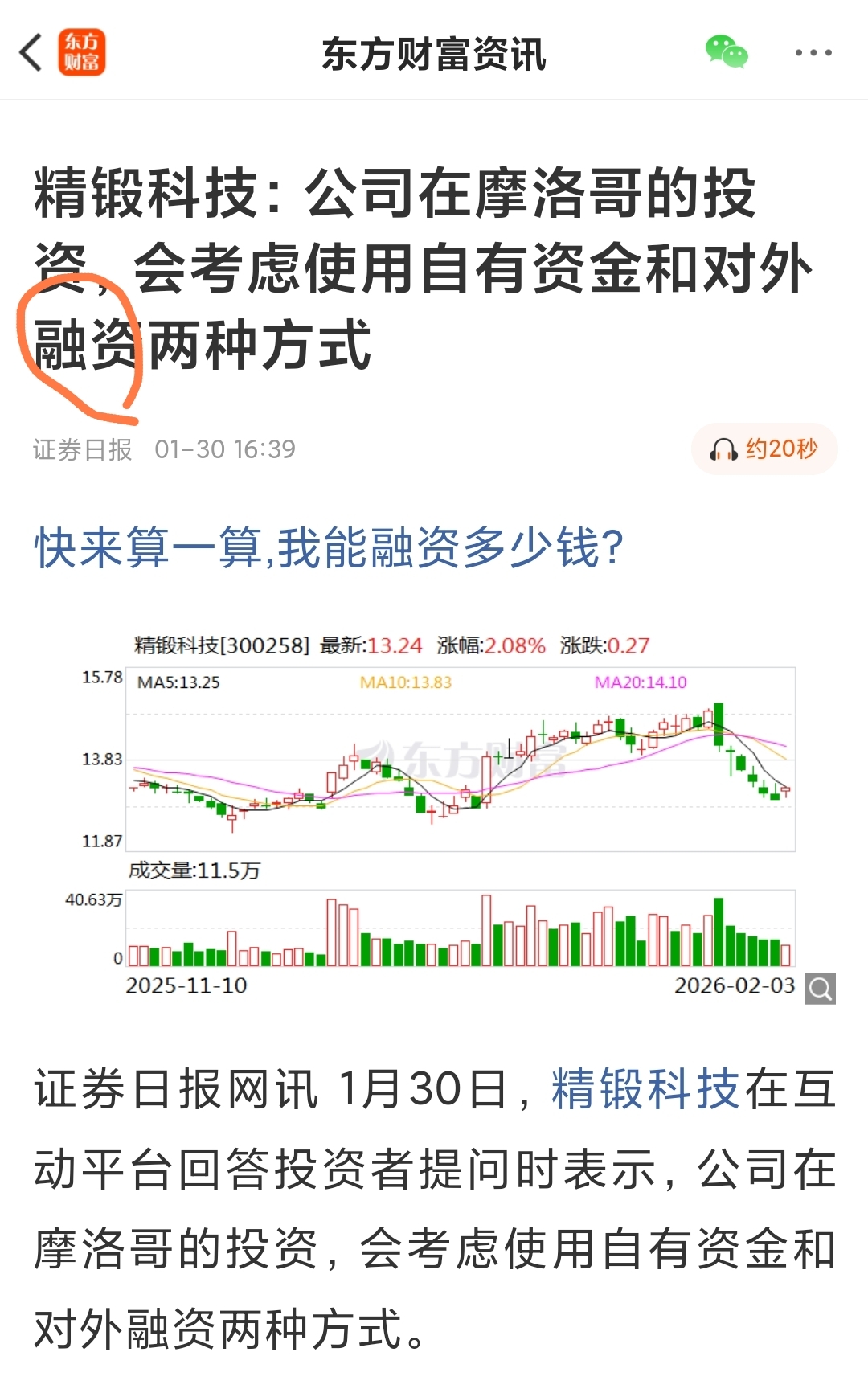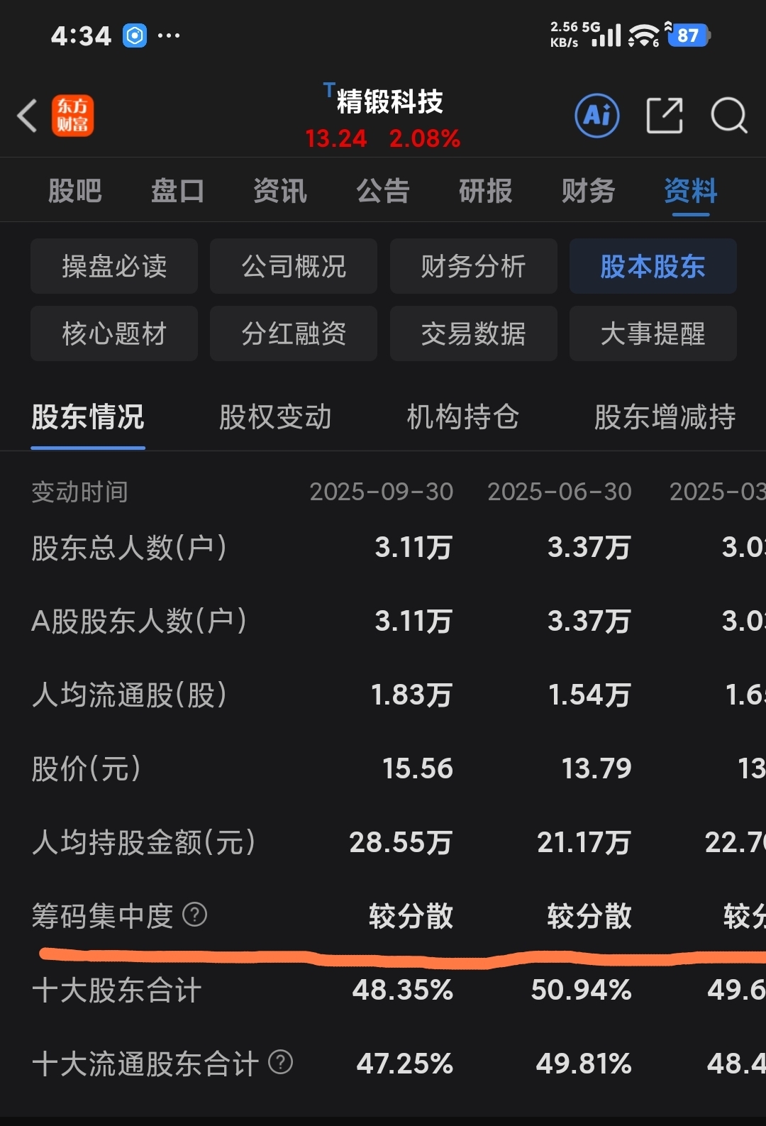 $精锻科技(SZ300258)$ 筹码集中度较分散,今天又是散户行情,小散线上升,超级大单出逃。今缩量阳线,高点又没超过昨高,明天周三又是阴线。关键是公司又出融资方案,利空中线后市。市值靠融资增大,而非公司自身优势股价上涨市值增大。
