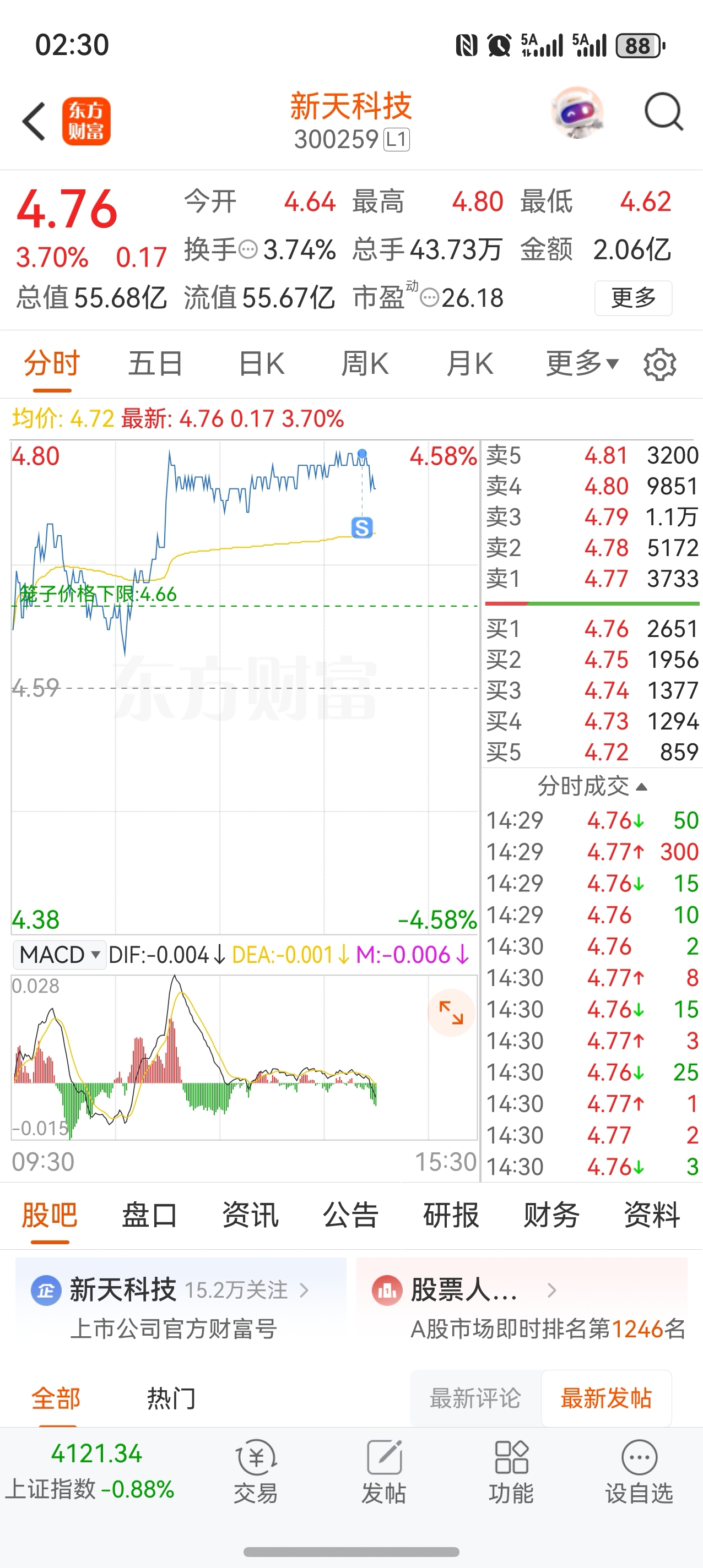 $新天科技(SZ300259)$ 应该是今天最高点出了吧,4.88上不去,还要到4.5左右震荡
