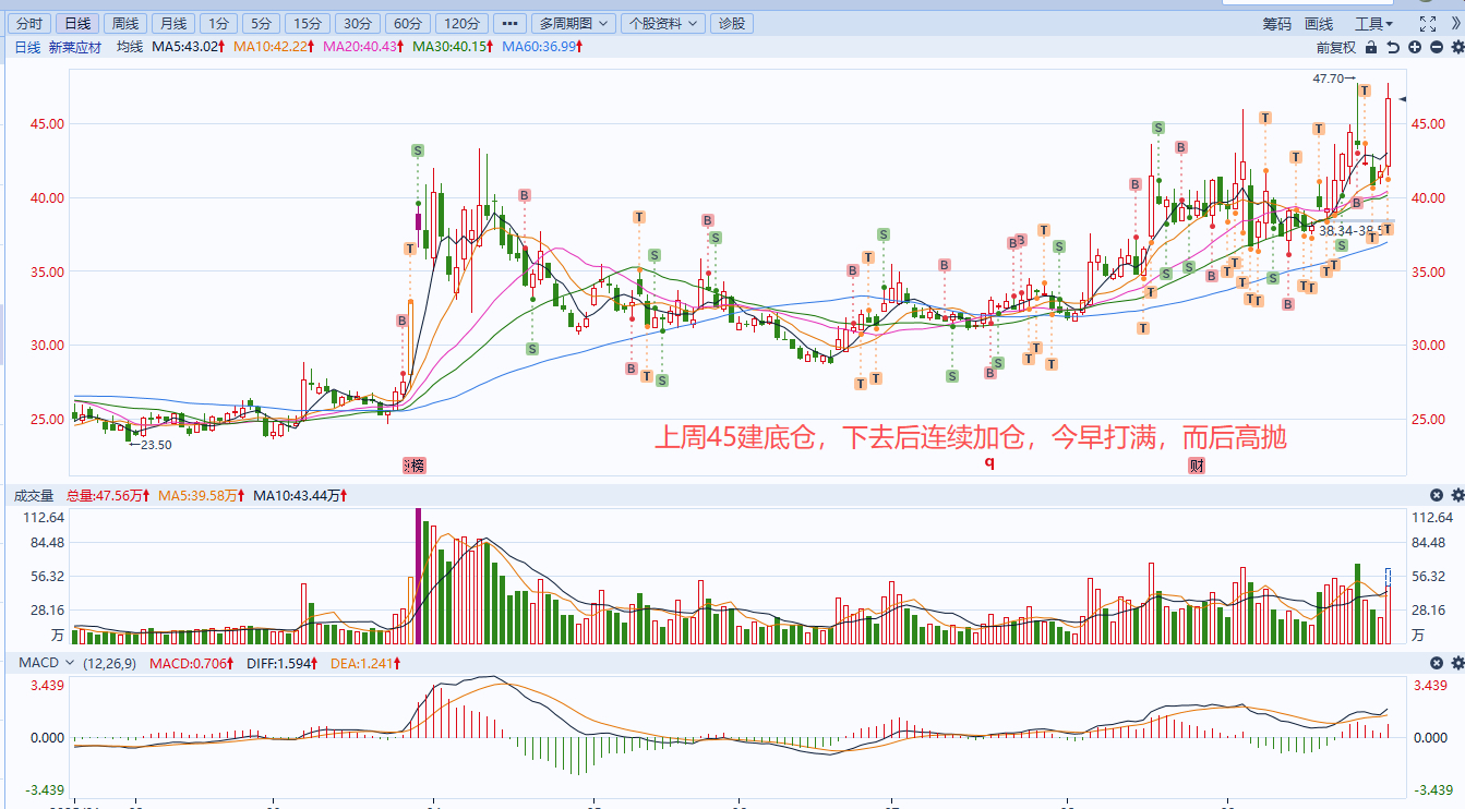感谢新莱主力大哥的大红包,上周45建的底仓,然后一直低吸,今天一早绿盘加仓,而后