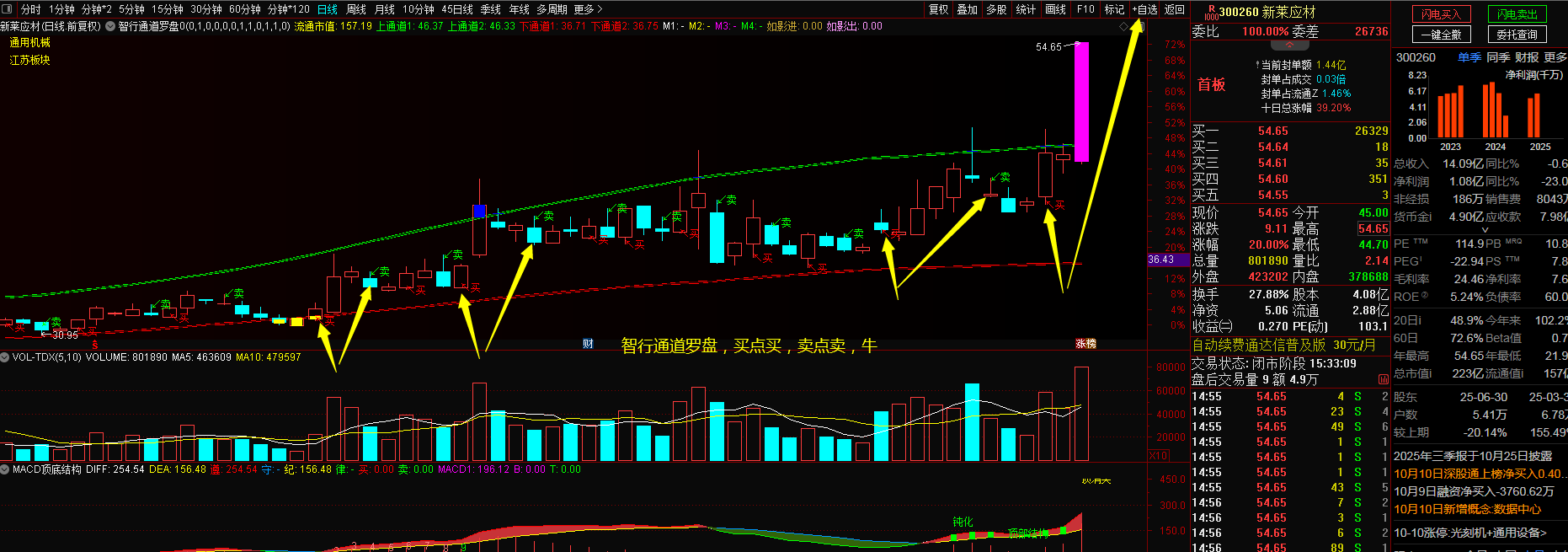 有图有真相,看智行通道罗盘对新莱应材买卖点的指示。买点出现时,股价正要起飞,按提示买入,坐等收益攀升。卖点一现,股价随即有调整迹象,及时卖出落袋为安。