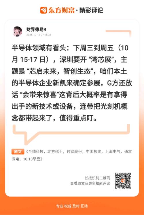 //@财界德易B :半导体领域有看头:下周三到周五(10 月 15-17 日),深圳要开 “湾芯展”,主题是 “芯启未来,智创生态”,咱们本土的半导体企业新凯来确定参展,G方还放话 “会带来惊喜”这背后大概率是有拿得出手的新技术或设备,连带把光刻机概念都带起来了,值得重点盯。 $新莱应材(SZ300260)$$扬杰科技(SZ300373)$$兆易创新(SH603986)$