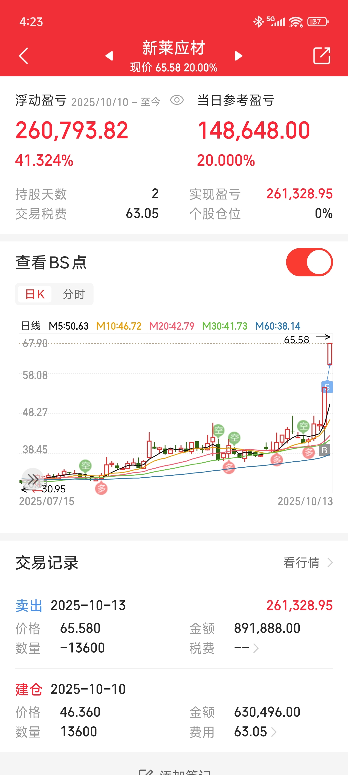$新莱应材(SZ300260)$ 我真是一个小韭菜啊,两天赚了41个点,就给卖了。