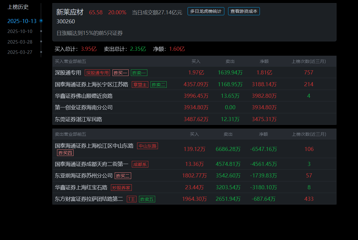 新莱应材今日游资龙虎榜席位上榜数据如下!