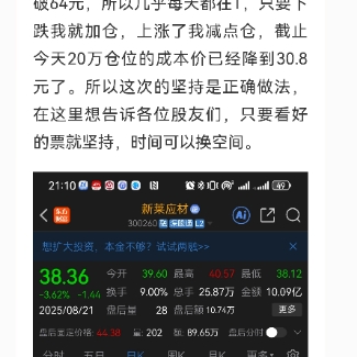 $新莱应材(SZ300260)$ 从5万仓位试盘,到慢慢加仓到现在20万,在这段时间这个票就是涨一天跌一天,涨两天跌两天,反反复复的磨人,中间快要放弃了,但因为我坚定相信它能突破64元,所以几乎每天都在T,只要下跌我就加仓,上涨了我减点仓,截止今天20万仓位的成本价已经降到30.8元了。所以这次的坚持是正确做法,在这里想告诉各位股友们,只要看好的票就坚持,时间可以换空间。