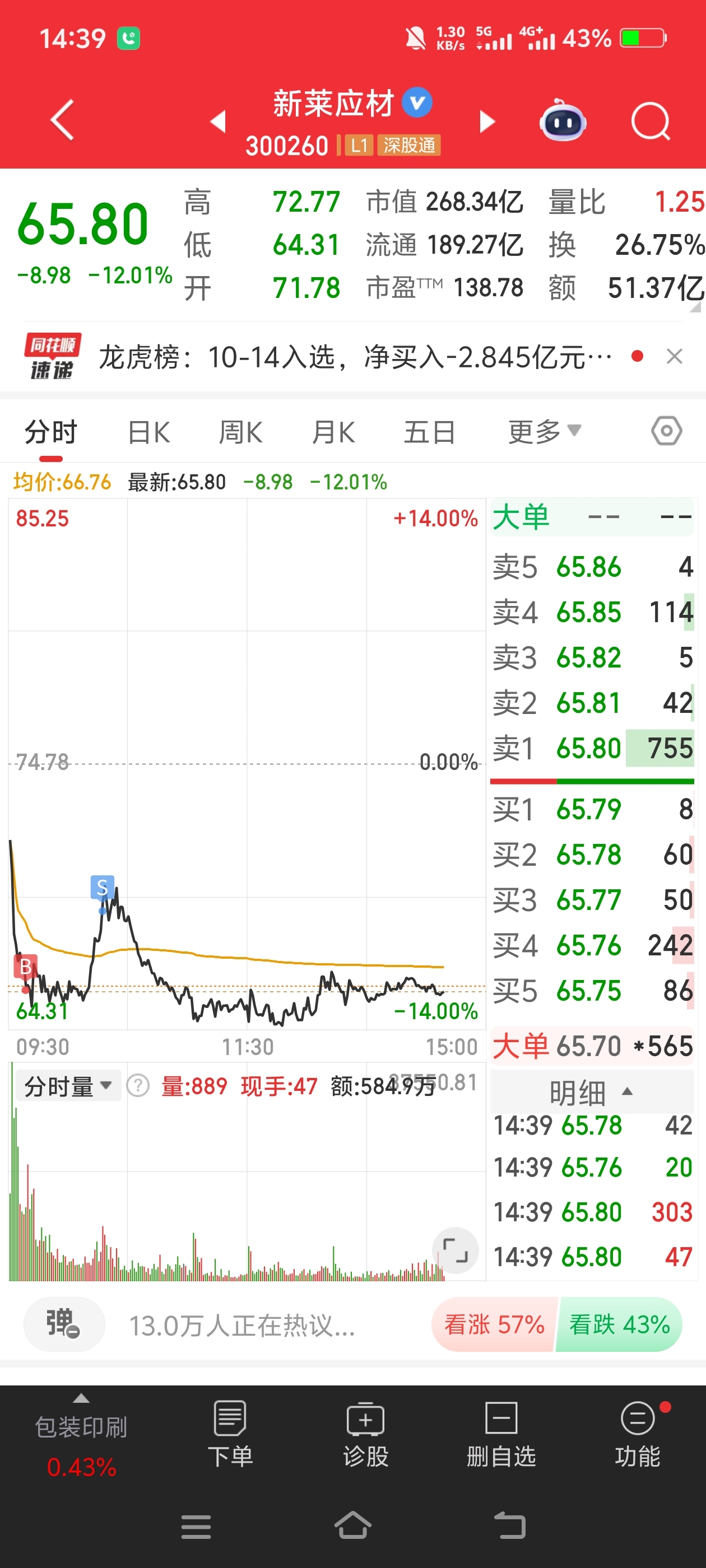 $新莱应材(SZ300260)$ 买了2千股,拉高又卖了2千股。只能这样做做T,减少一点亏损