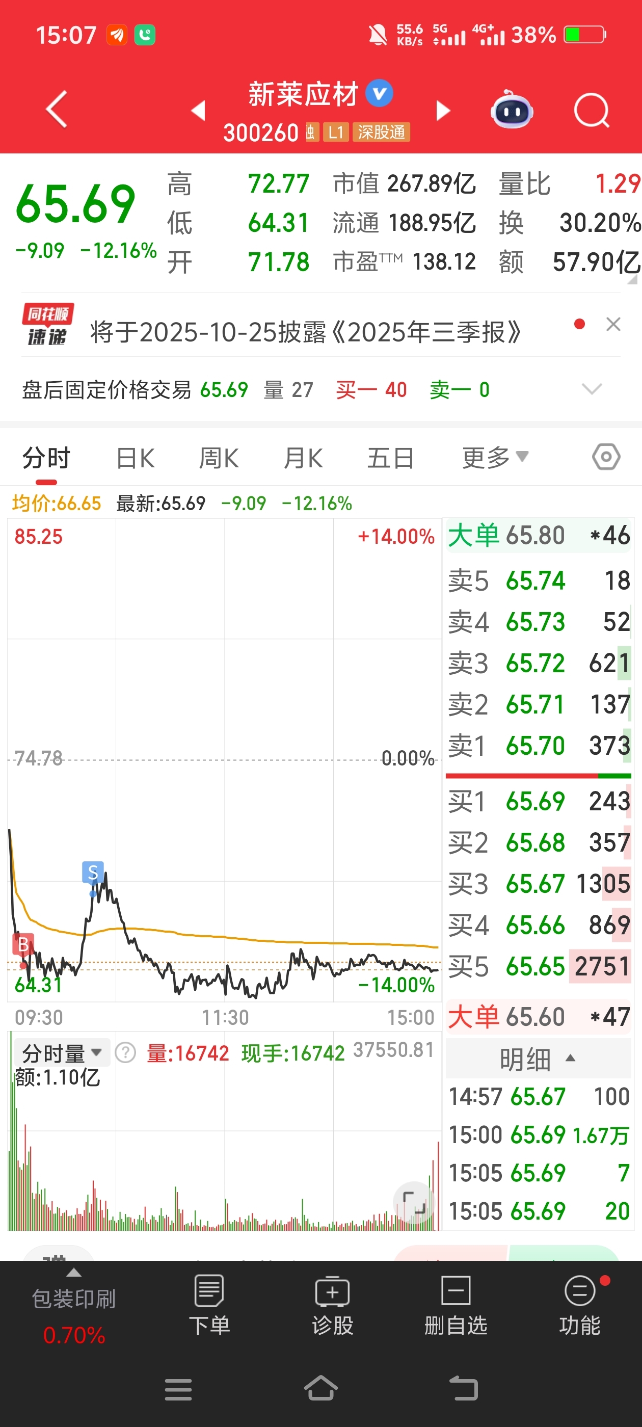 $新莱应材(SZ300260)$ 已老实。昨天下午一直在犹豫要不要走,结果还是贪婪了,选择了格局。本来是从从容容,游刃有余,结果现在是匆匆忙忙,连滚带爬。所幸买得早,利润还有不少,明天大概率继续格局,难道新莱到此为止了吗?我不信!!!