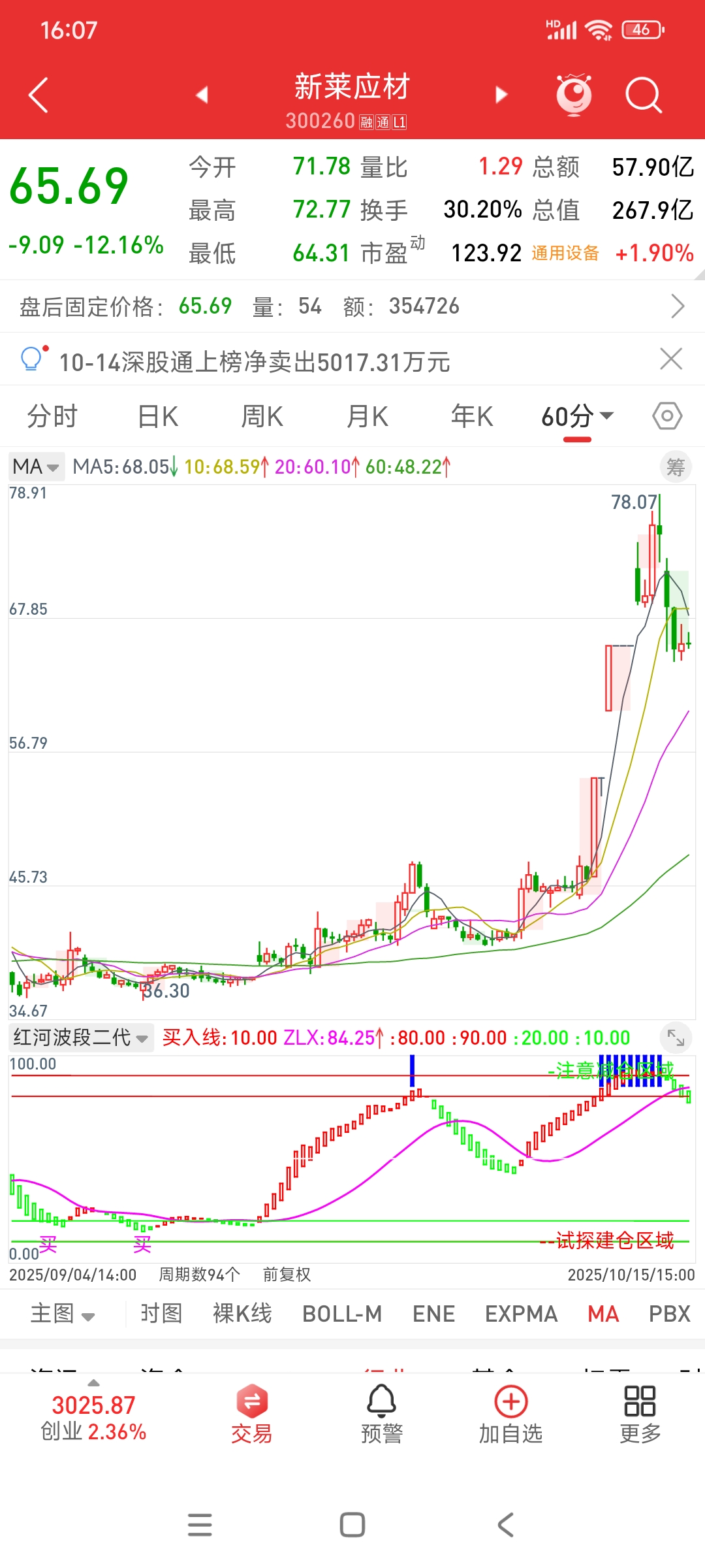 $新莱应材(SZ300260)$ 60分钟级别顶部红转绿以后一路下行,这里继续看短线回调,毕竟绿柱不停,回调不止,注意风险吧。