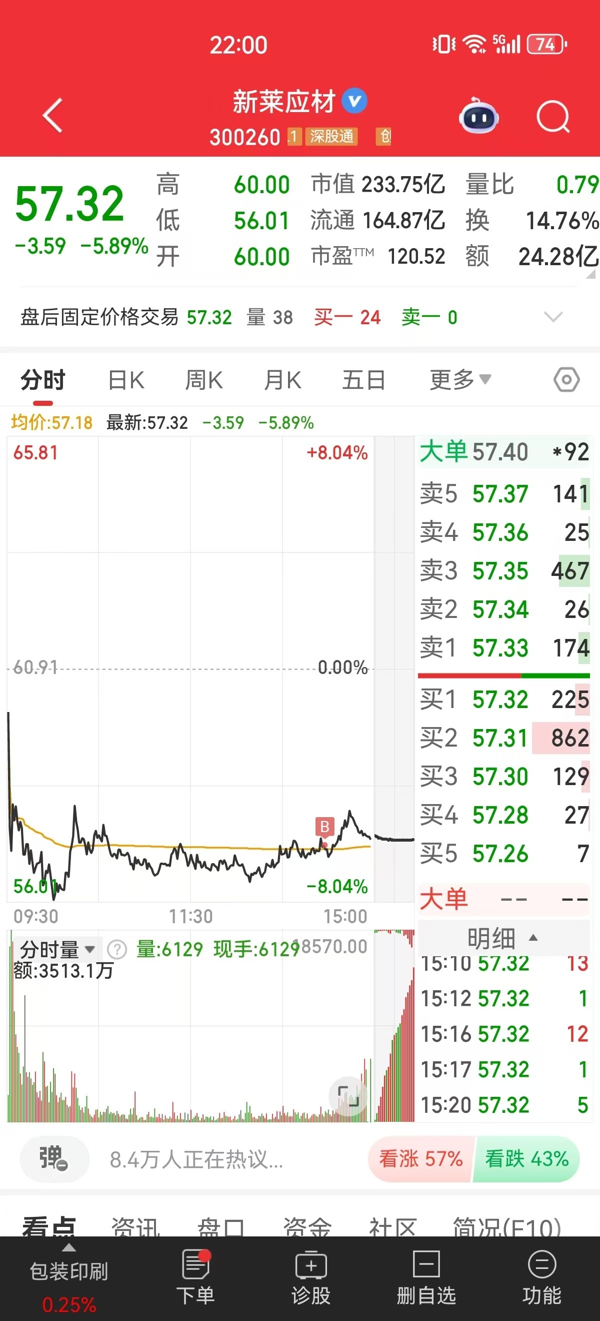 下午买入300260新莱应材,半导体+包装+精密零部件,今天下探56,有强力承接