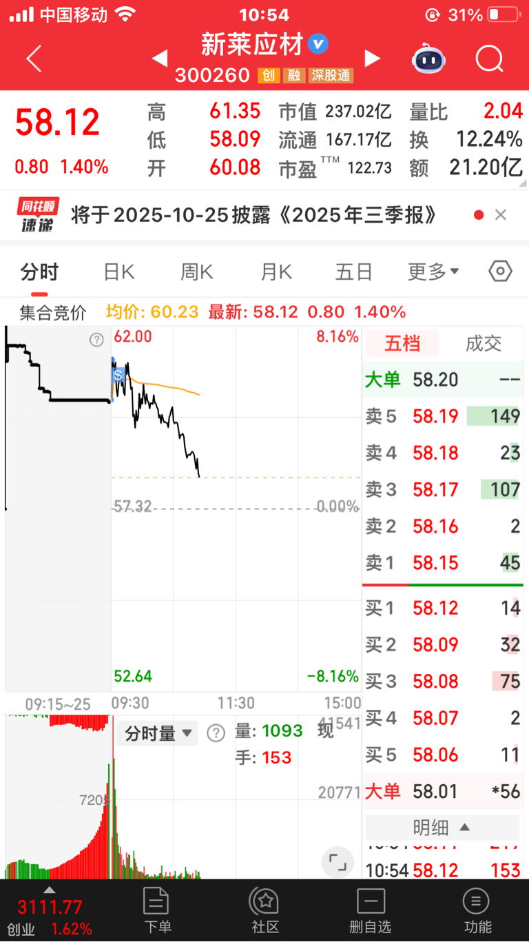 $新莱应材(SZ300260)$ 明天竞价要不要先走?62---65?再砸回来59?