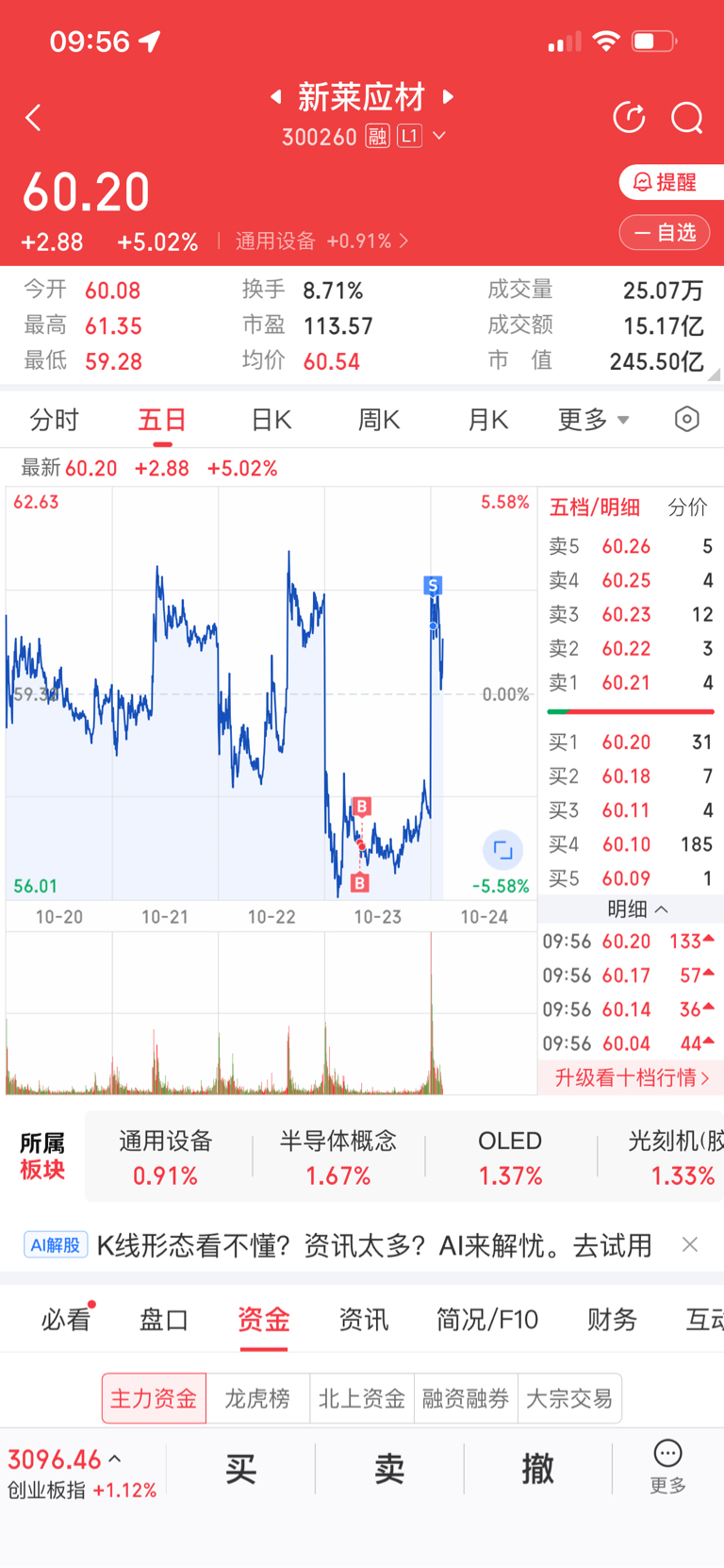 $新莱应材(SZ300260)$ 61卖了。涨停和我没关系了!干一次就跑了不来了
