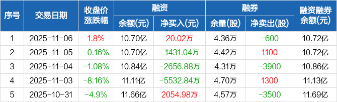 新莱应材:融资净买入20.02万元,融资余额10.7亿元(11-06)