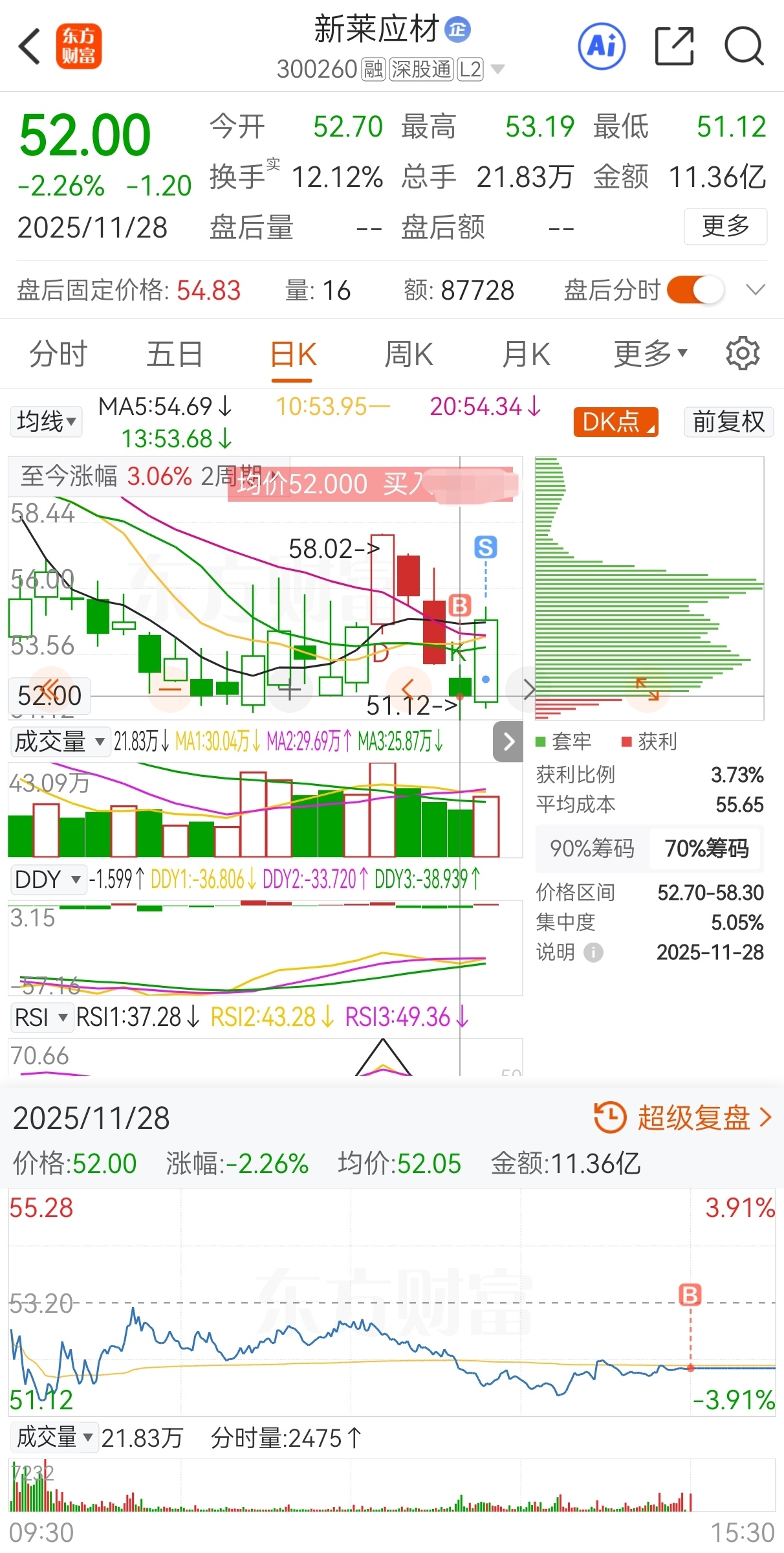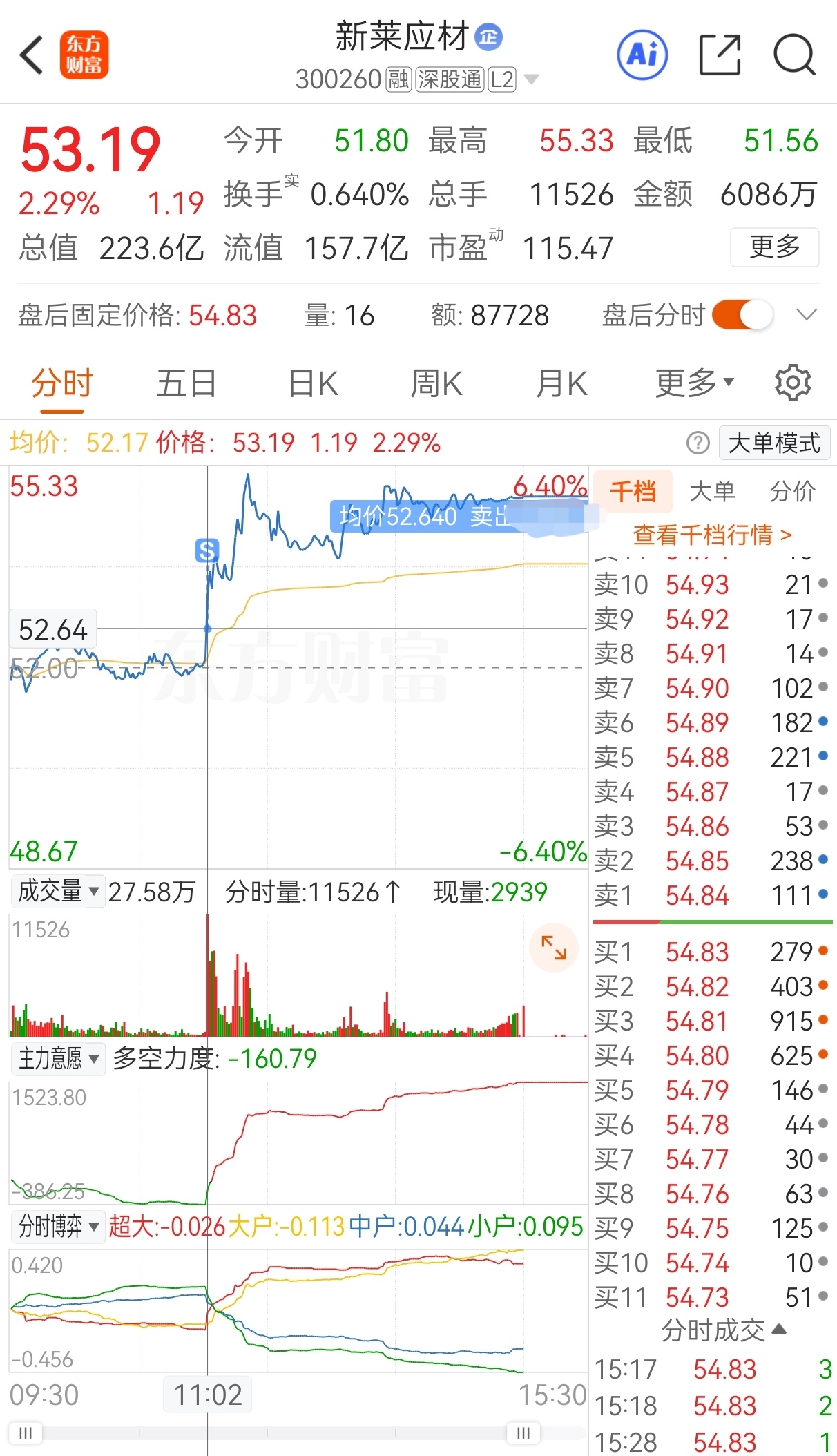 今买明卖,52买,52.64卖,实盘隔夜套利新莱应材,成功收米走人!