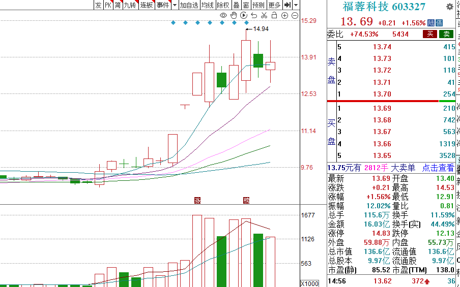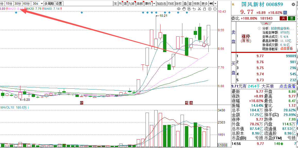 形态跟福蓉科技差不多,一样是做补涨思路,今天走得比福蓉科技更强,还可以去封涨停板,早评的想法是去踩20日均线都是正常的,今天低开低走,刚好就是在20日线附近获得支撑,然后反弹上去入场,点位刚刚好,公司是做芯片的,最近要收购功能性涂层复合材料的金张科技,公司称收购事项目前正处于审核阶段,市场固然是照着这个题材做补涨。福蓉科技虽然也涨,可是缺了题材,国风新材能上板,这个就是区别。