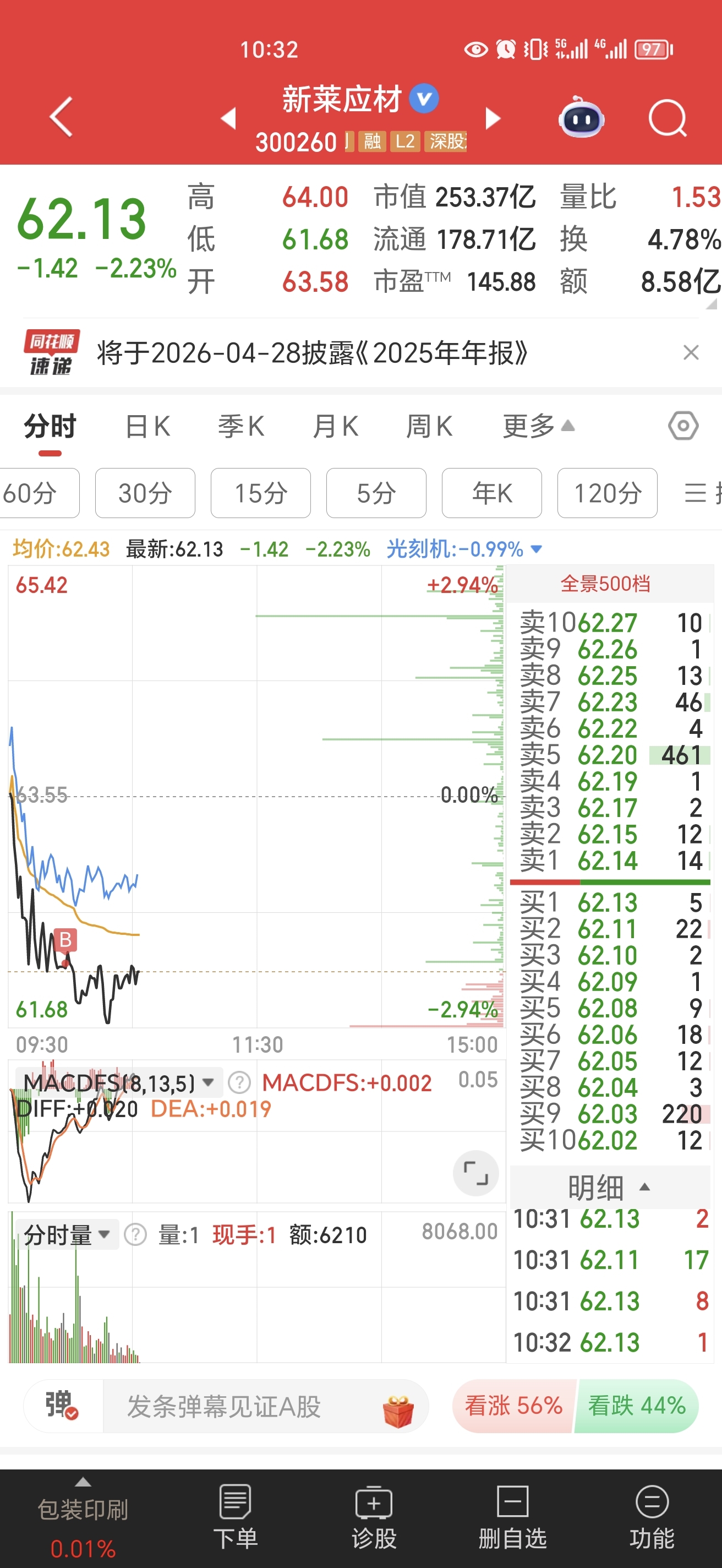 $新莱应材(SZ300260)$ 做个T,废柴次次回踩不落下,板块跌幅靠前,股性太差太差