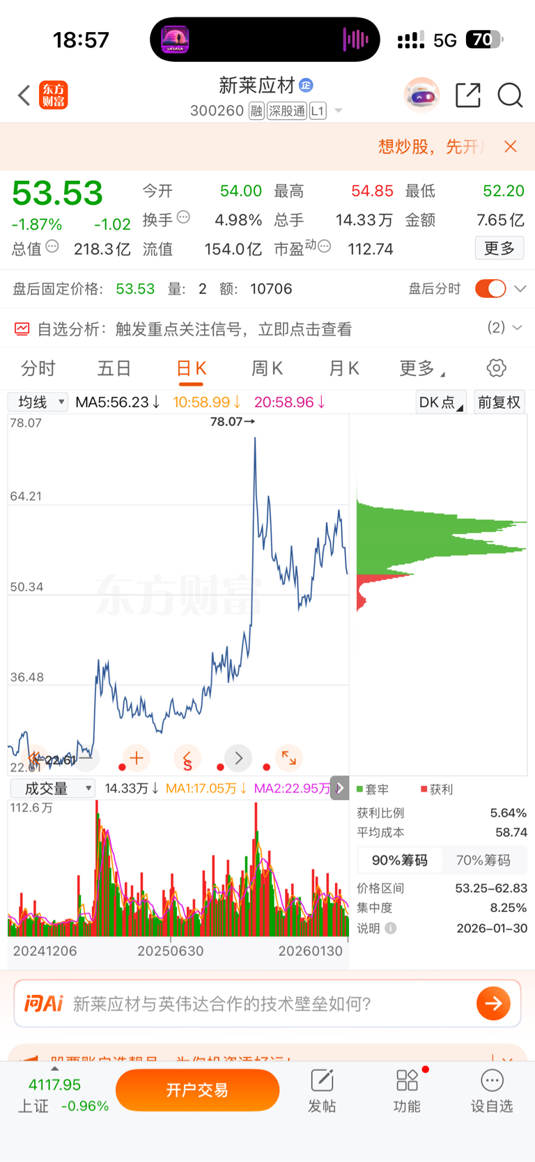 $新莱应材(SZ300260)$ 看这个筹码峰,上面套牢盘都没出,等待上方筹码割肉,筹码峰下移后才能进行下一波,又是一场硬仗了