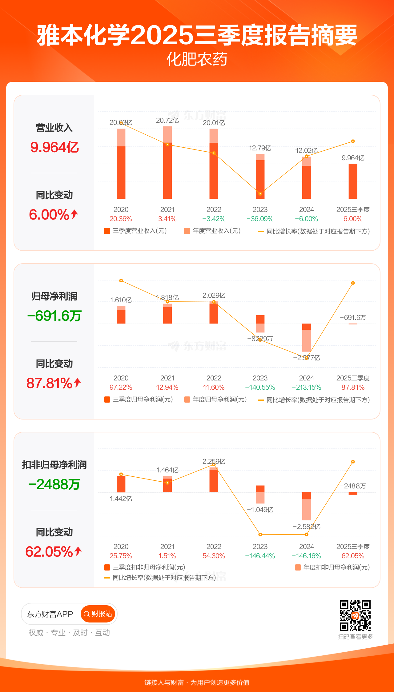 雅本化学10月29日发布2025年三季报显示,公司前三季实现营业收入9.96亿元,同比增长6.00%;归母净利润-691.64万元;扣非归母净利润-2488.24万元。