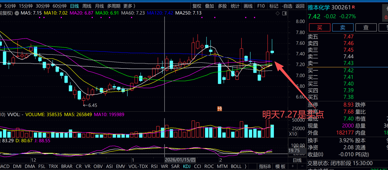 明天雅本化学的M5、M10、M20、M30四条均线全部在7.25-7.27,明天必定回到7.27!!!