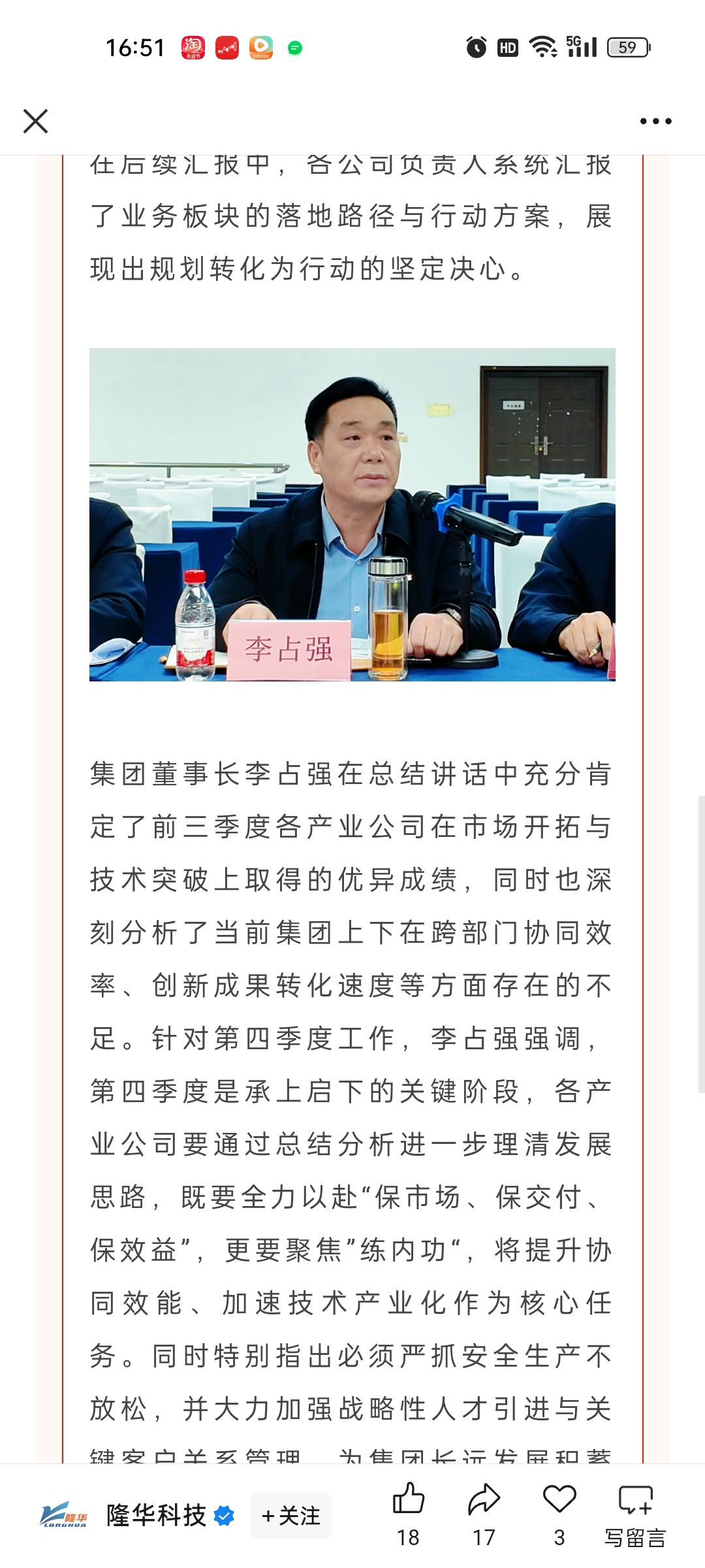 $隆华科技(SZ300263)$ 集团董事长李占强在总结讲话中充分肯定了前三季度各产业公司在市场开拓与技术突破上取得的优异成绩。