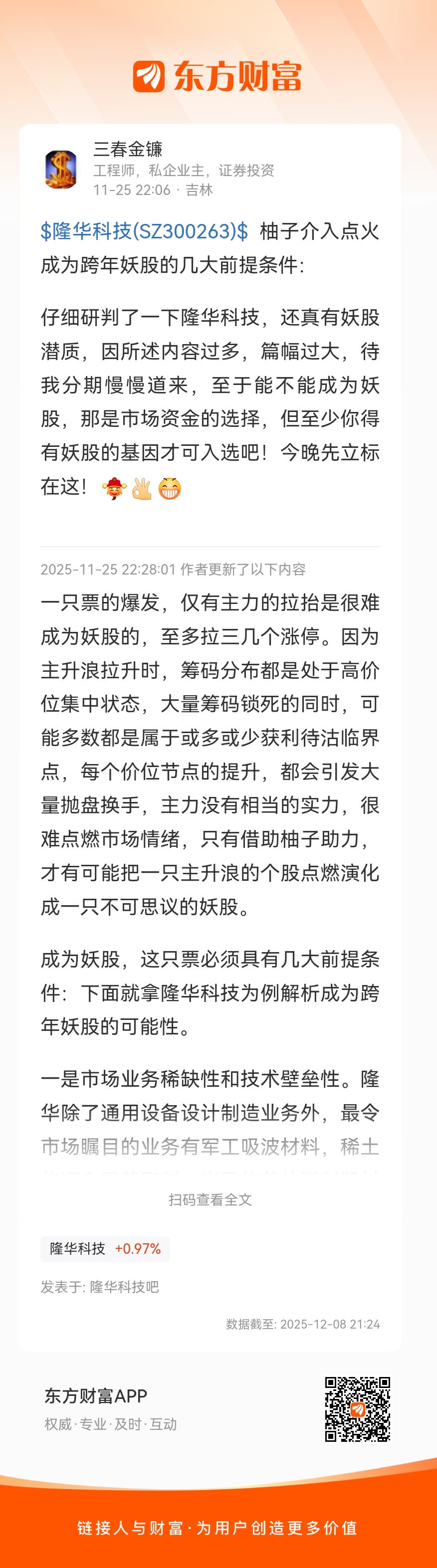 $隆华科技(SZ300263)$ 柚子介入点火成为跨年妖股的几大前提条件: