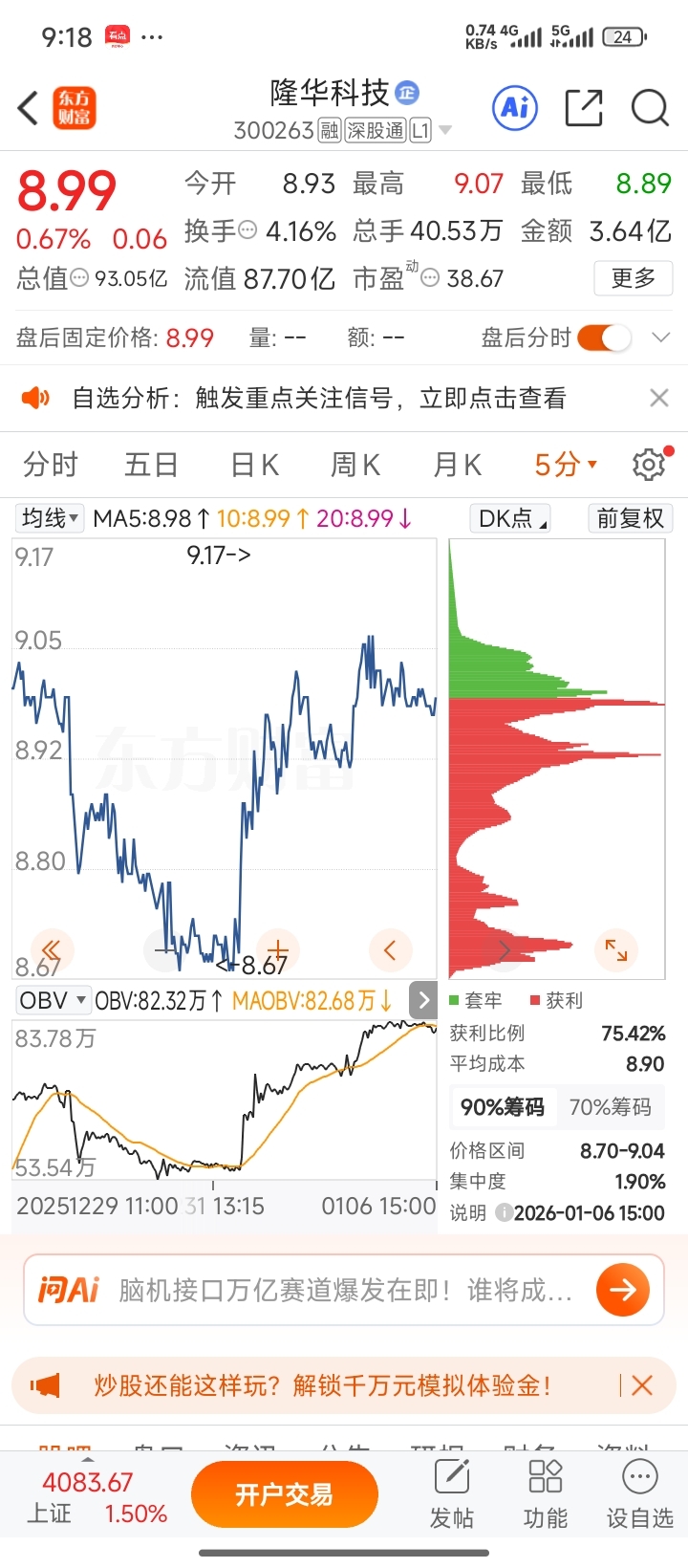 $隆华科技(SZ300263)$ 5分钟obv能量潮不断走高而股价横盘,主力暗中吃货,大家安心持股。
