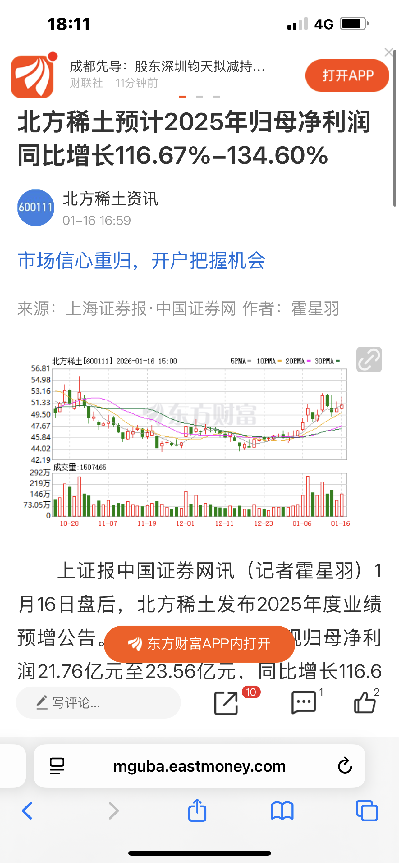 隆华科技大利好:北方稀土业绩预增116 %-134 %21亿一23亿,主要原因是产销两旺,隆华作为北方稀土萃取剂的供应商,业绩增长有了明确的增长预期。