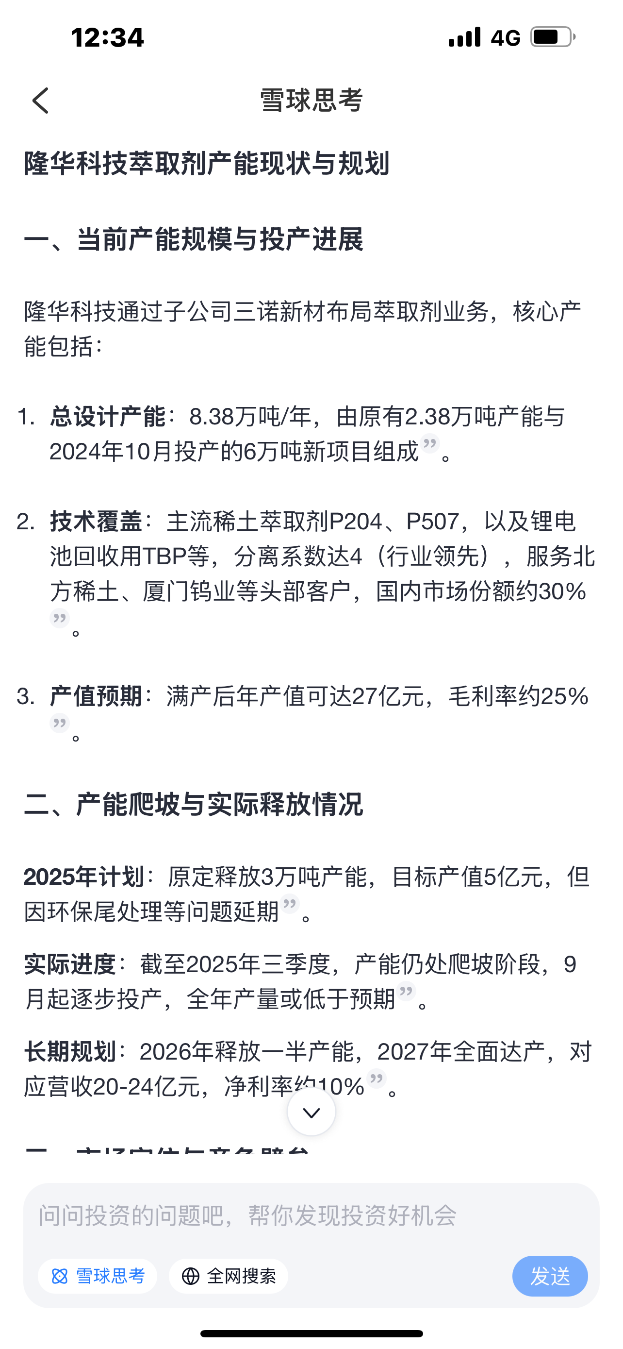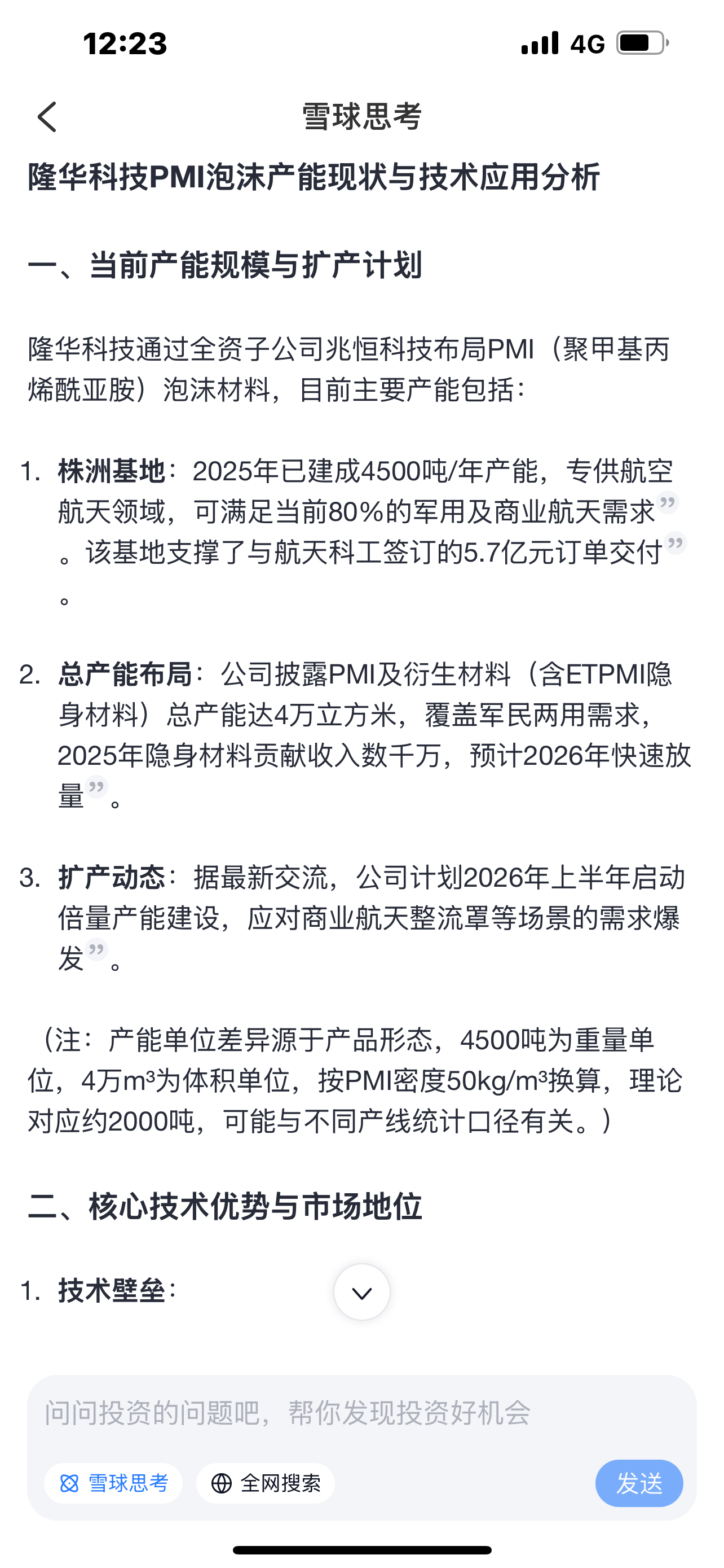 管理层现在打击概念炒作,利好干实业的隆利科技。商业航天隆华科技MPl泡沫2025年产能提升至2万立方米扩了1倍多,钙钛矿电池方面隆华的靶材产能又增加500吨扩了1倍2期也在推进中,锂电池回收方面萃取剂从2万吨增加到8万吨扩大了4倍现正在爬坡中,由此可见隆华科技在产能方面已经高度重视商业航天产业、钙钛矿电池(太空光伏)、锂电池回收产业大发展的重要机遇,只有投入真金白银做实业才能成为行业发展的领头羊。