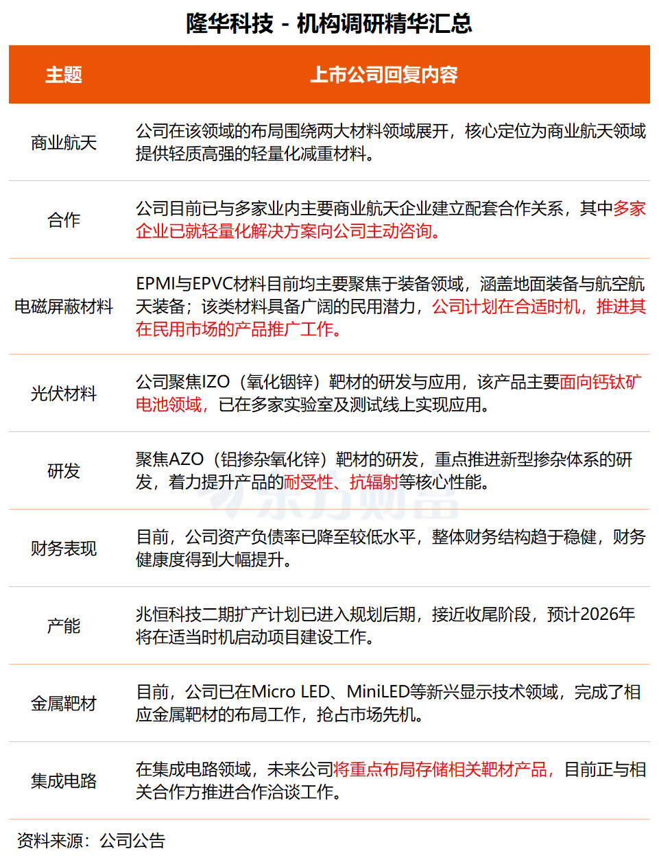 在调研中,隆华科技透露,公司目前已与多家业内主要商业航天企业建立配套合作关系,其中多家企业已就轻量化解决方案向公司主动咨询。