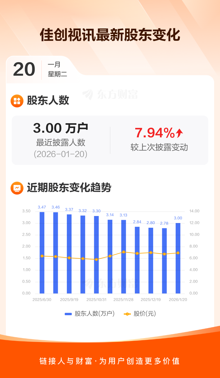 佳创视讯:截至1月20日最新股东户数3.00万户,较上期增加7.94%
